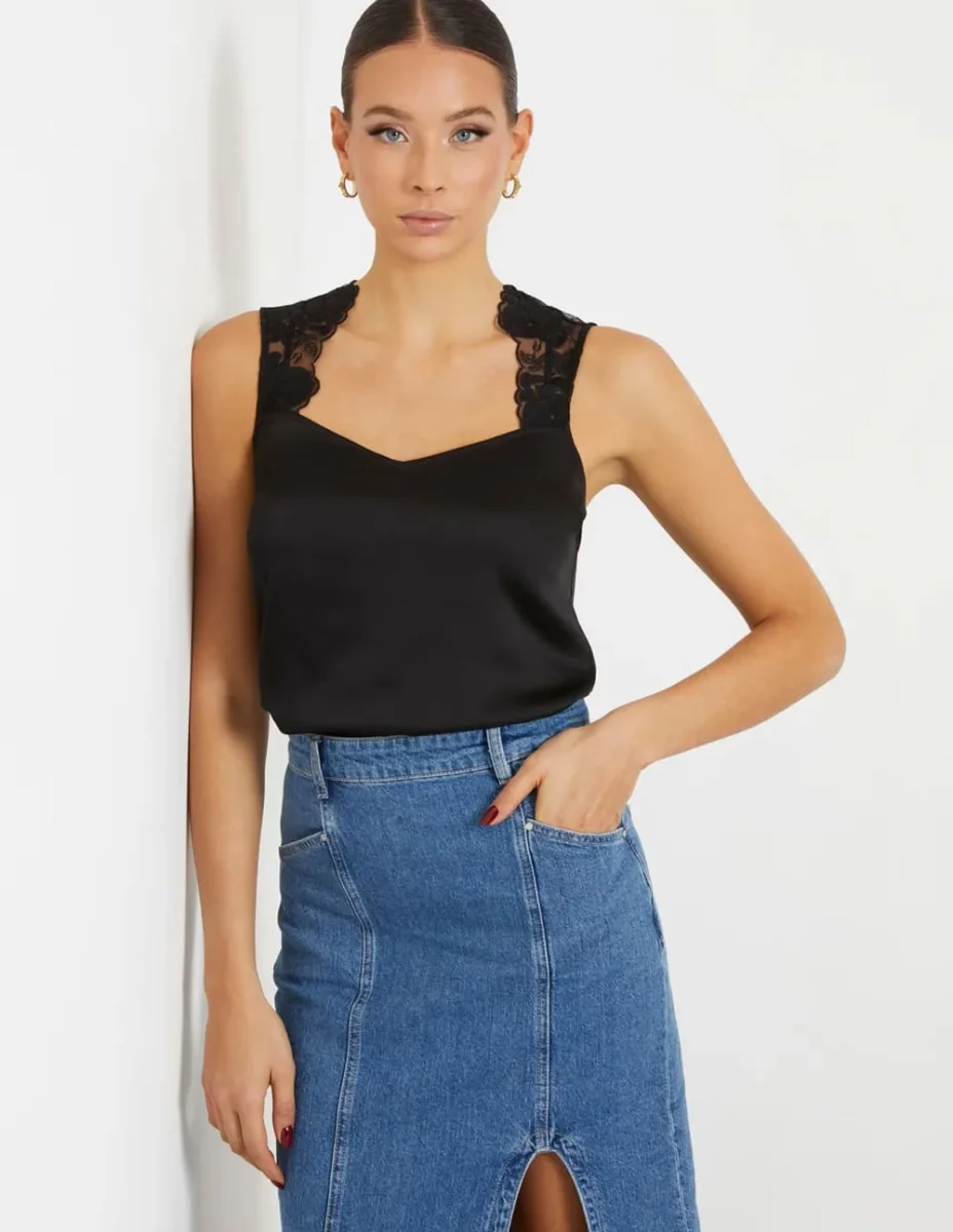 Top GUESS con Aplicación de Encaje Negro Mujer