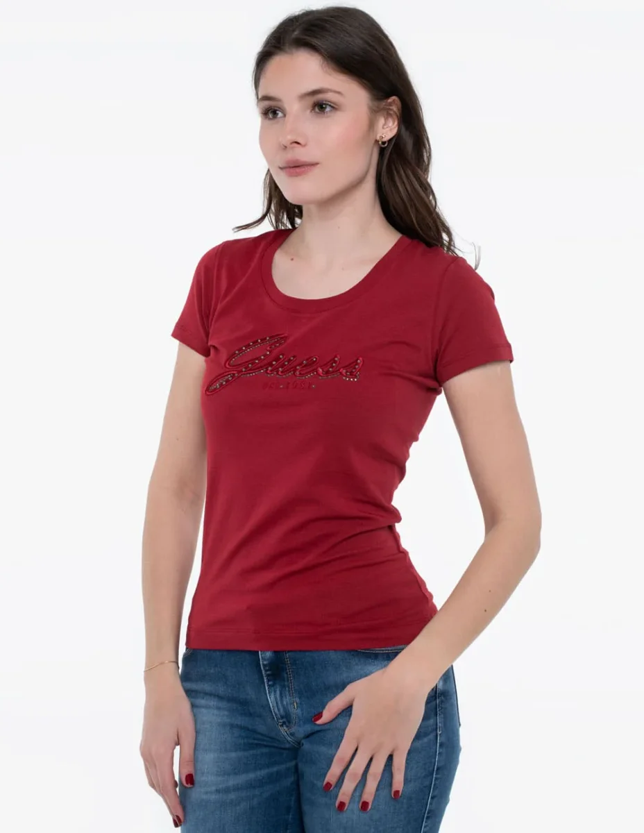 Camiseta GUESS con Logo Bordado Roja Mujer