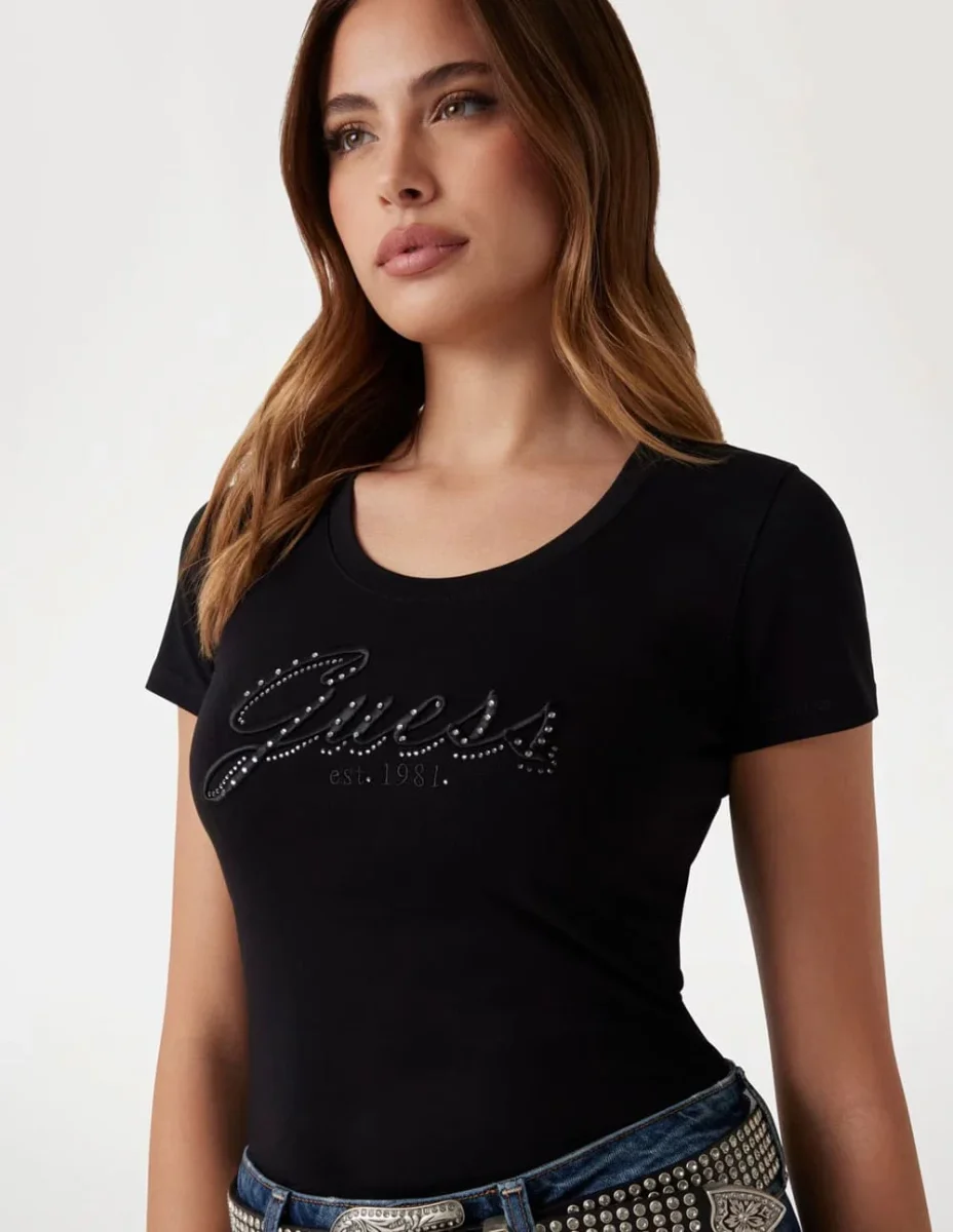 Camiseta GUESS con Logo Bordado Negra Mujer