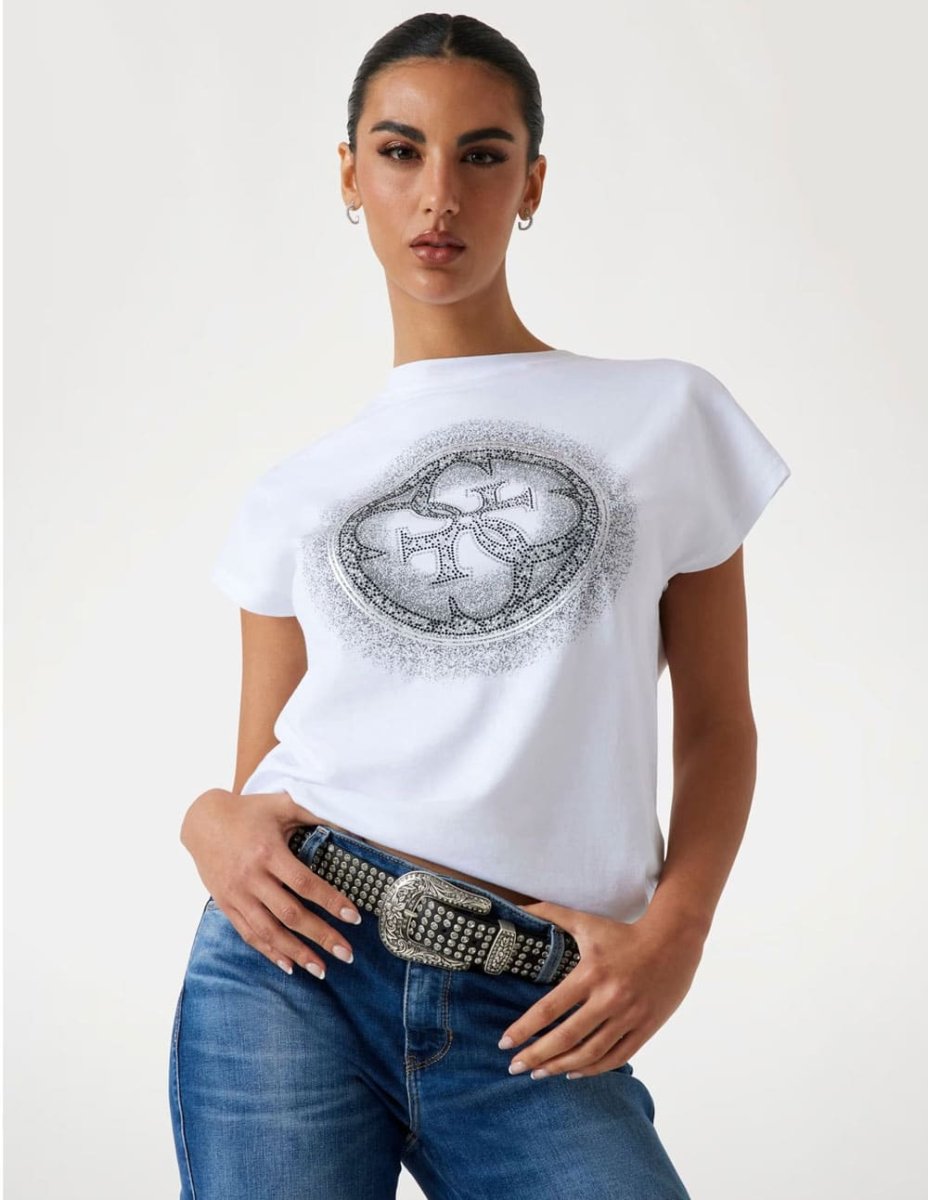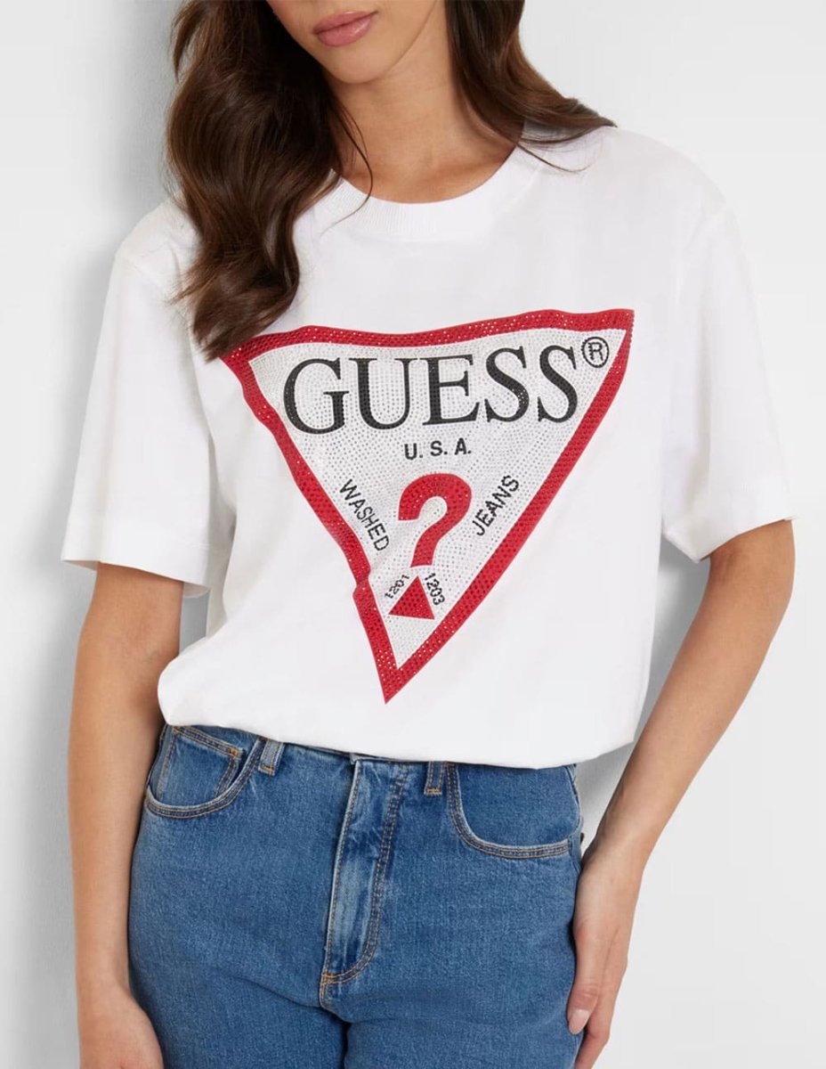 Camiseta GUESS con Logo Triángulo Strass Blanca Mujer