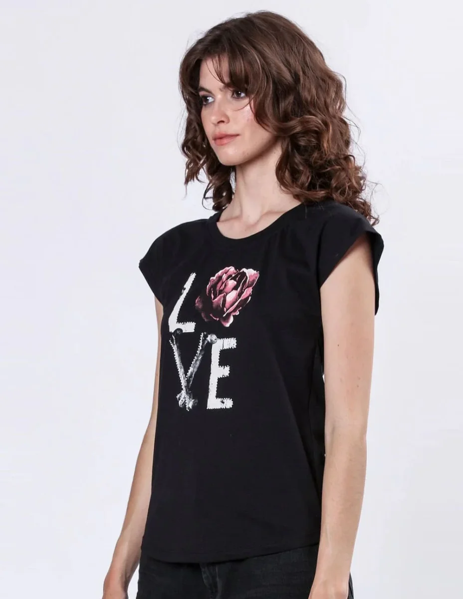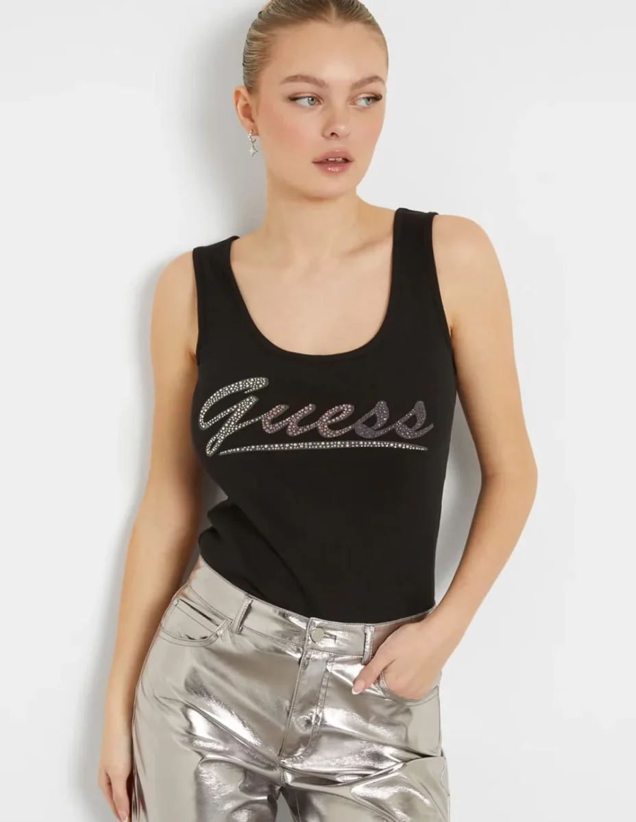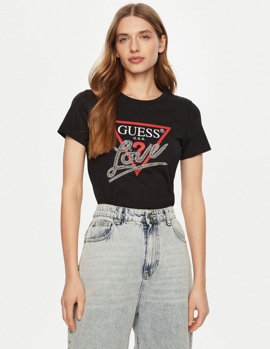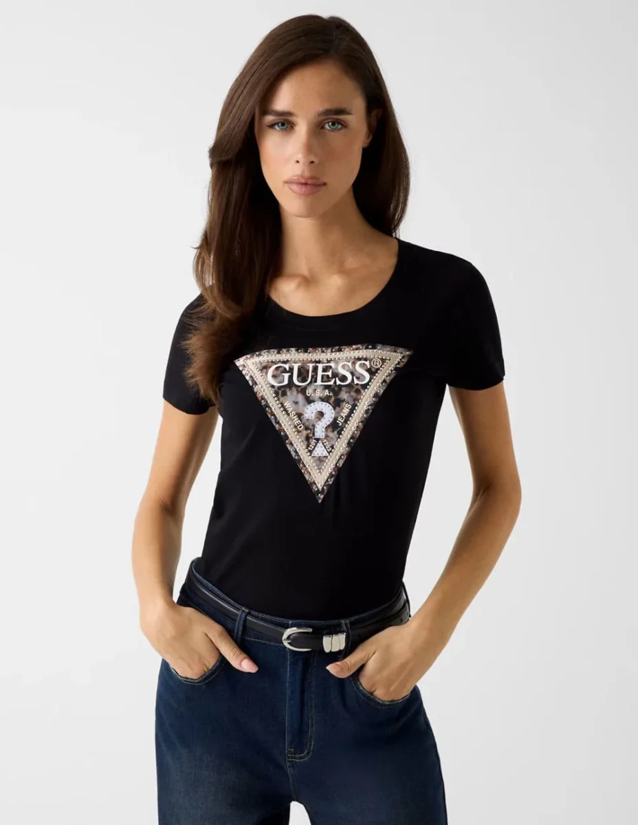 Camiseta GUESS con Logo Triángulo con Strass Negra