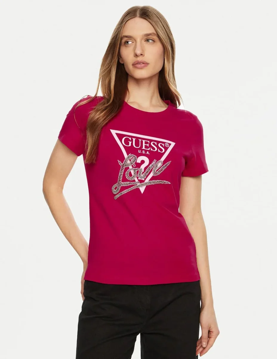 Camiseta GUESS con Logo Triángulo con Strass Rosa Mujer