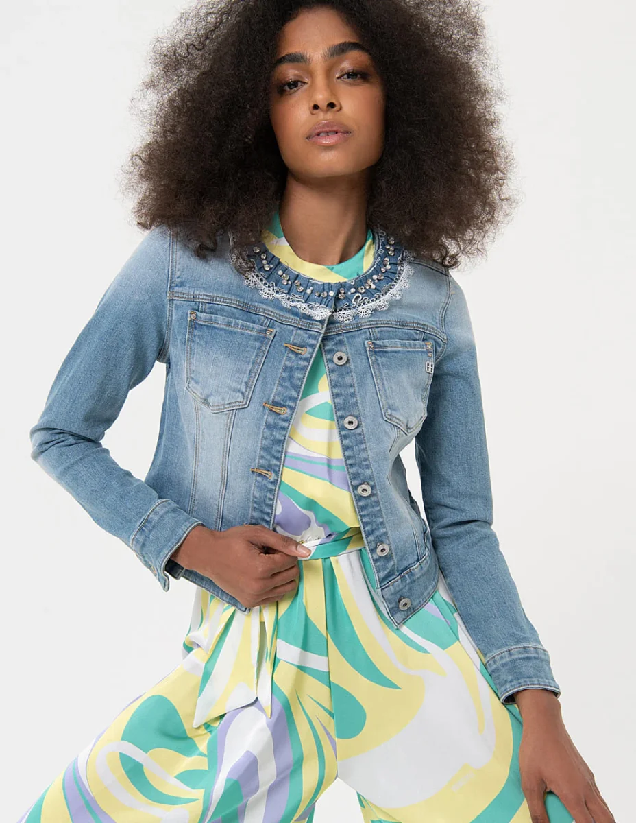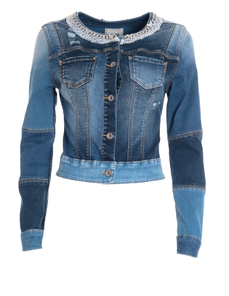 Chaqueta Vaquera FRACOMINA Cortita con Aplicaciones Brillantes en el Cuello Azul Mujer
