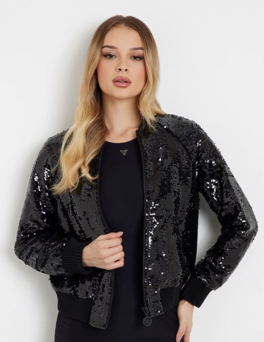 Chaqueta Bomber GUESS de Lentejuelas Negra Mujer