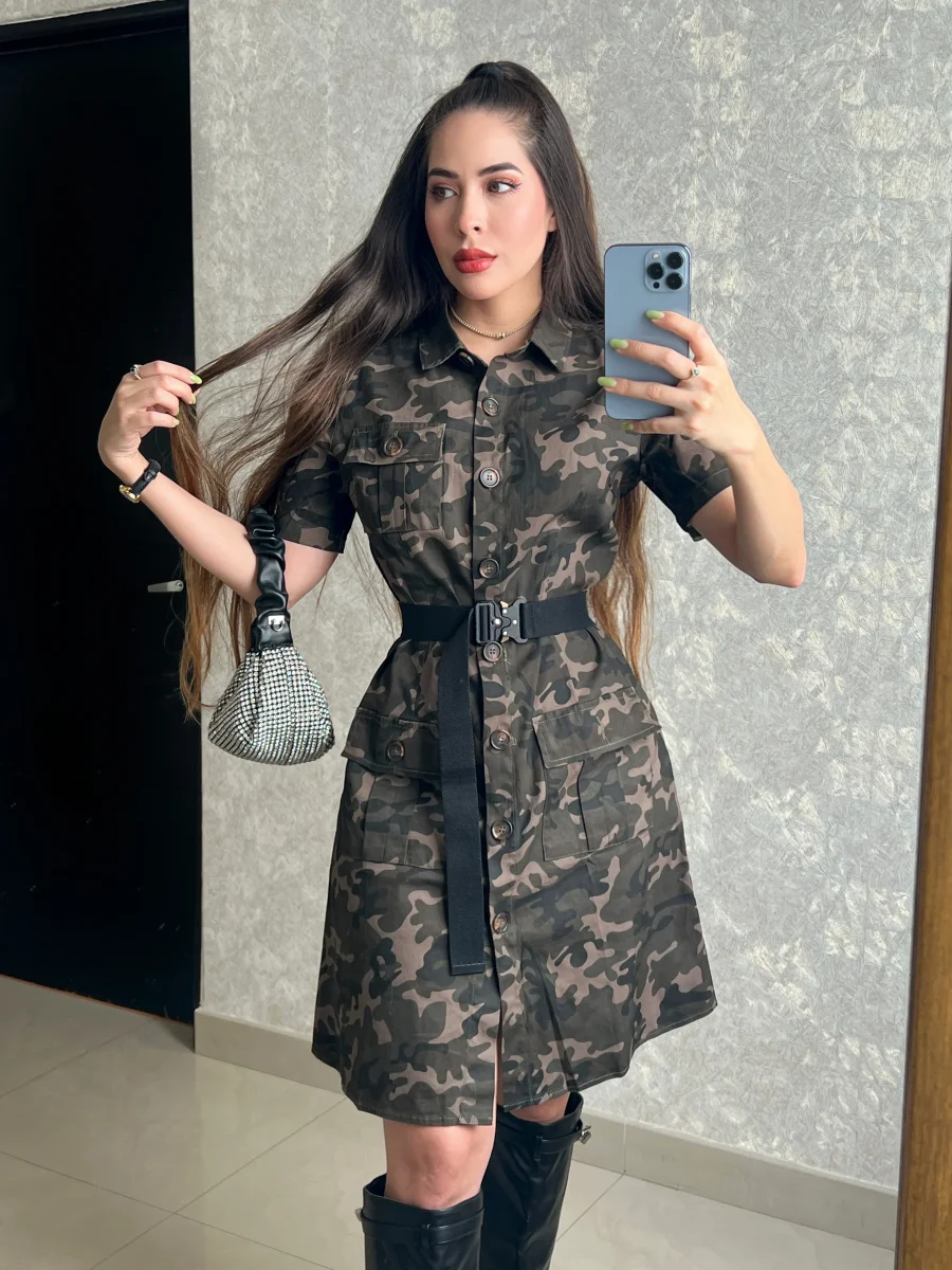 VESTIDO ESTAMPADO MILITAR CON CINTURÓN