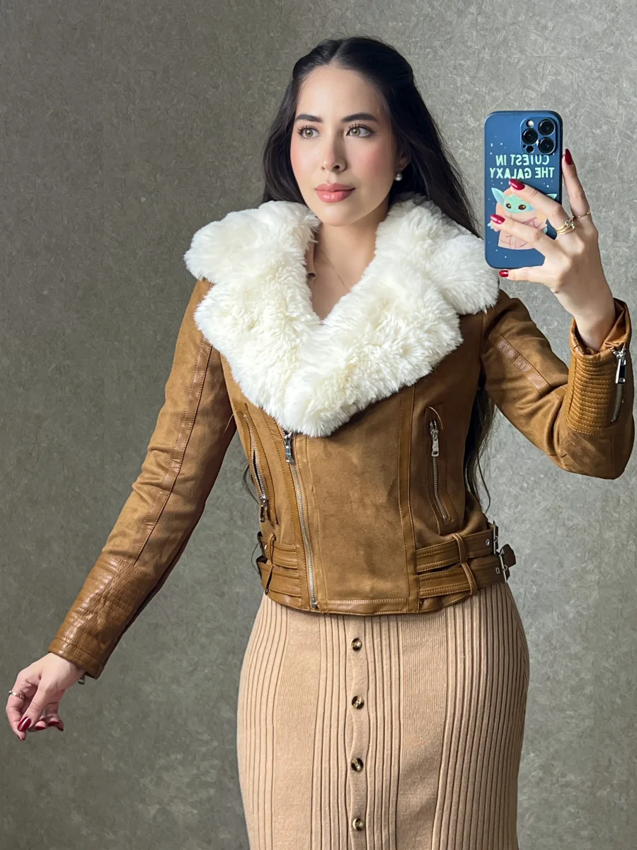 ABRIGO CAFE DE VINIPIEL Y PELUCHE