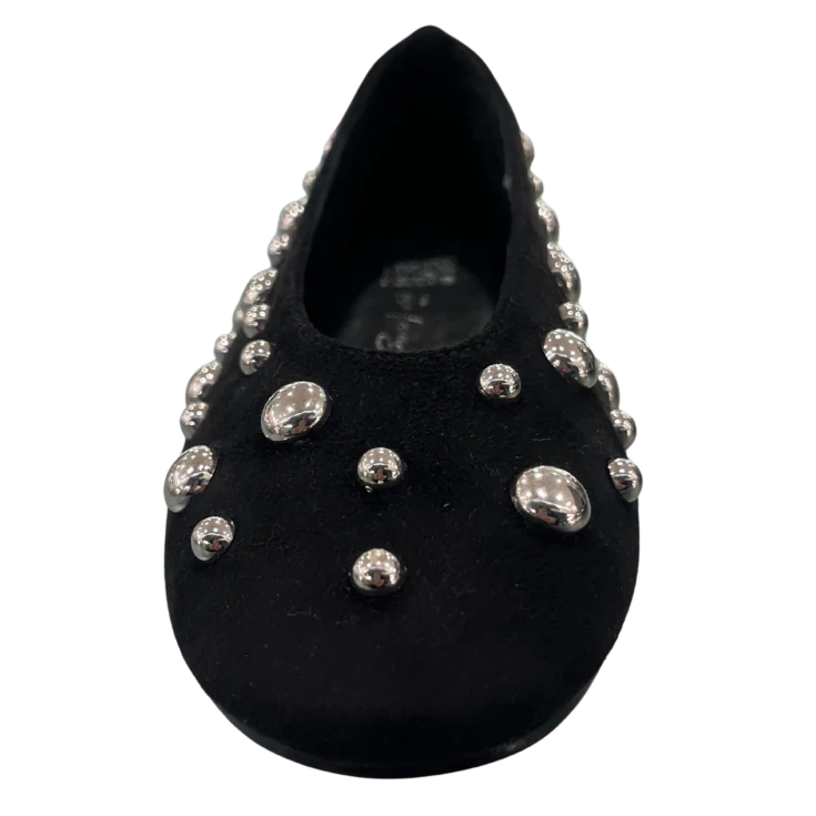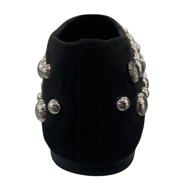 La antelina ofrece un tacto sedoso y agradable, envolviendo el pie con suavidad. Los apliques metálicos aportan un sutil brillo que contrasta elegantemente con el negro profundo del material, creando un efecto visual sofisticado.