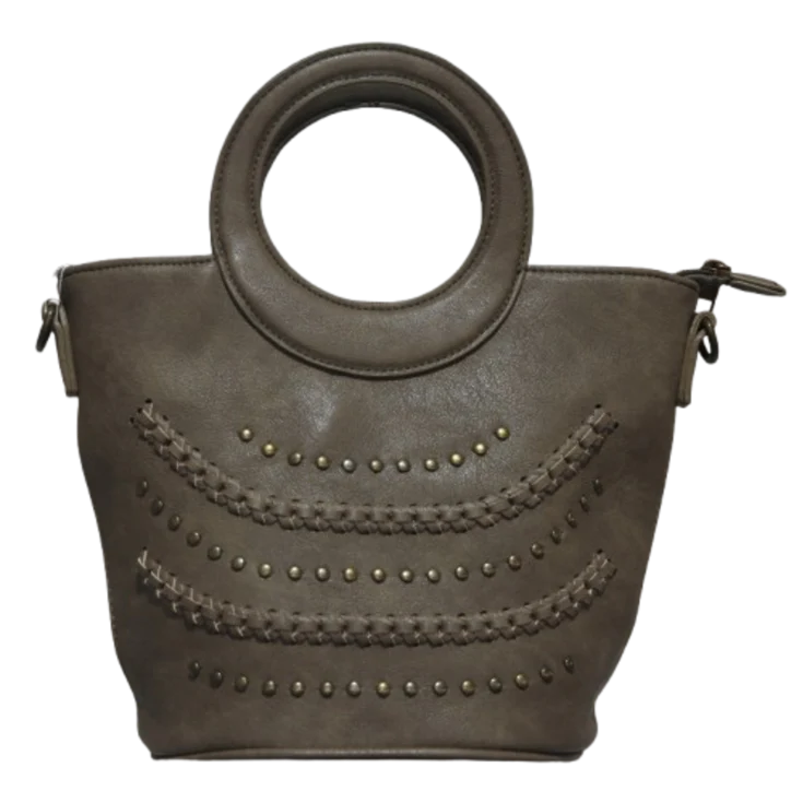 ● Detalle frontal con tachuelas metálicas doradas y trenzado decorativo.