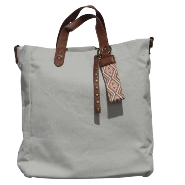 El tejido suave y robusto ofrece una sensación cálida al tacto, mientras los acabados en cuero y el adorno étnico aportan un contraste de estilo bohemio y sofisticado. Su color crema transmite luminosidad y frescura, ideal para cualquier temporada.
