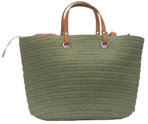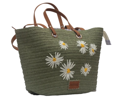 Bolso Mustang marcha, modelo imitación mimbre en color verde, con adornos de margarita, agarre en color cuero de mano y hombro, bastante ancho para que no se te quede nada en casa