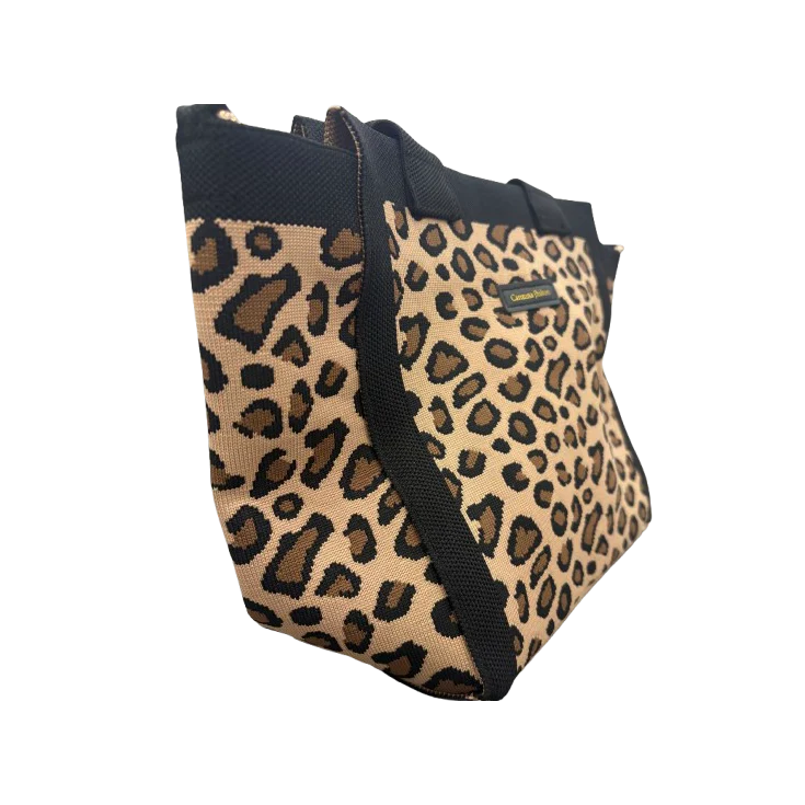 Confeccionado en material textil de alta resistencia, este bolso destaca por su estampado de leopardo en tonos tierra y negros, combinado con asas y ribetes en negro que aportan contraste y estructura. Su interior espacioso lo hace perfecto para llevar todo lo imprescindible y más.