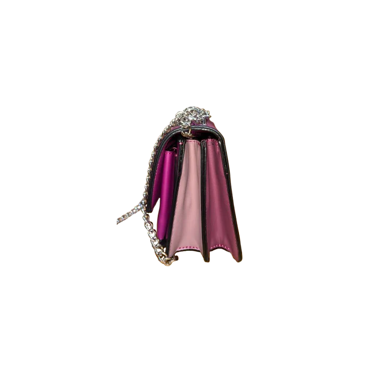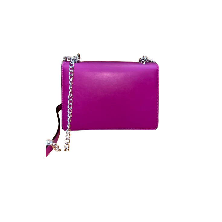 Un bolso compacto, moderno y lleno de carácter que destaca por su vibrante tono fucsia y su elegante herraje metálico frontal. La combinación de su cadena plateada y su acabado liso lo convierte en la pieza perfecta para elevar cualquier look con un toque sofisticado y atrevido.