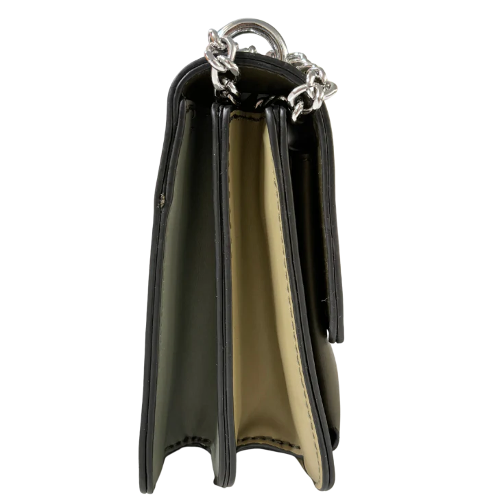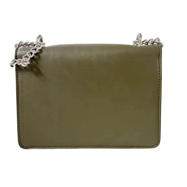 Al tacto, su superficie es suave y firme, transmitiendo sensación de calidad y durabilidad. El contraste entre el verde kaki y el brillo frío de la cadena metálica crea una experiencia visual equilibrada, moderna y sofisticada.