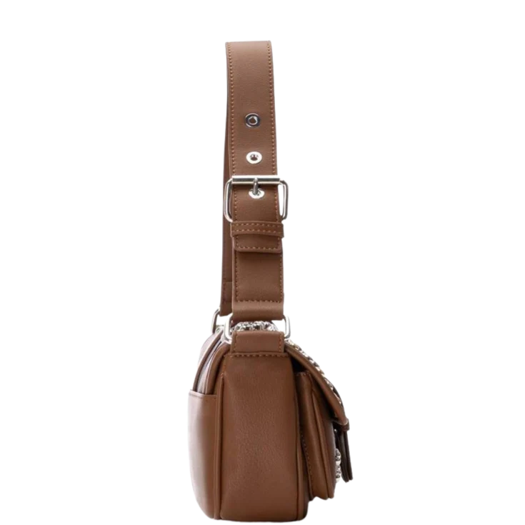 Al tacto sentirás la suavidad del acabado efecto piel mientras la estructura ligera mantiene su forma sin perder elegancia. El tono camel transmite calidez visual y versatilidad, adaptándose tanto a prendas claras como a colores más intensos. Al llevarlo al hombro o cruzado, la correa se ajusta con comodidad y el bolso acompaña cada paso con soltura.