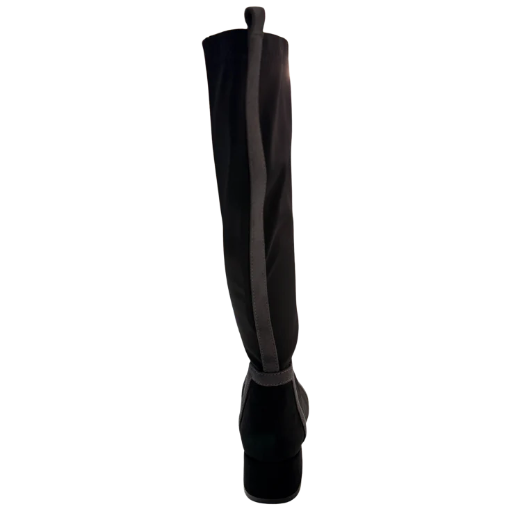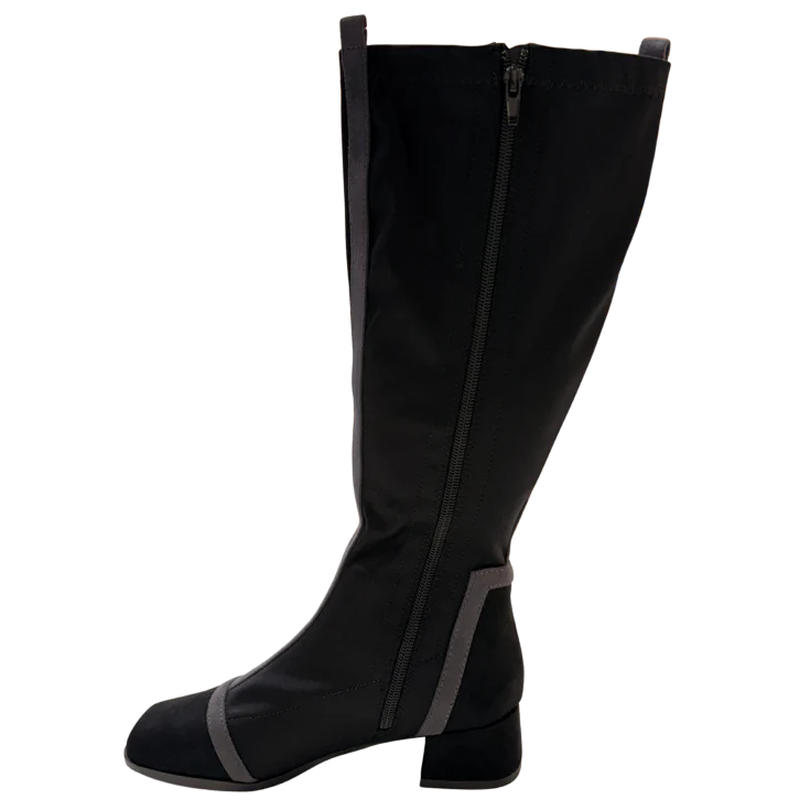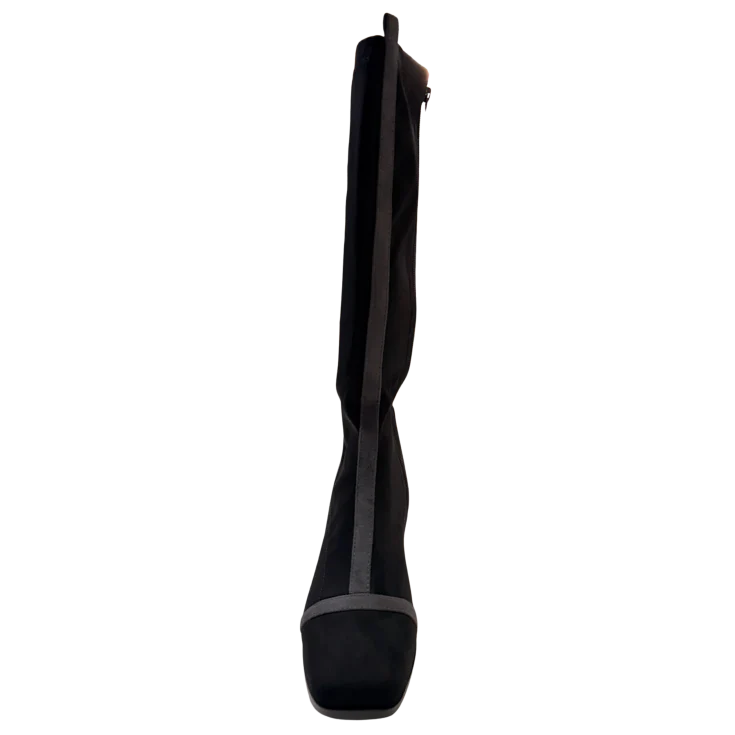 El material suave envuelve la pierna con una sensación firme pero agradable, adaptándose al movimiento al caminar. El tacón bajo aporta seguridad y equilibrio, haciendo que cada paso se sienta ligero y estable.