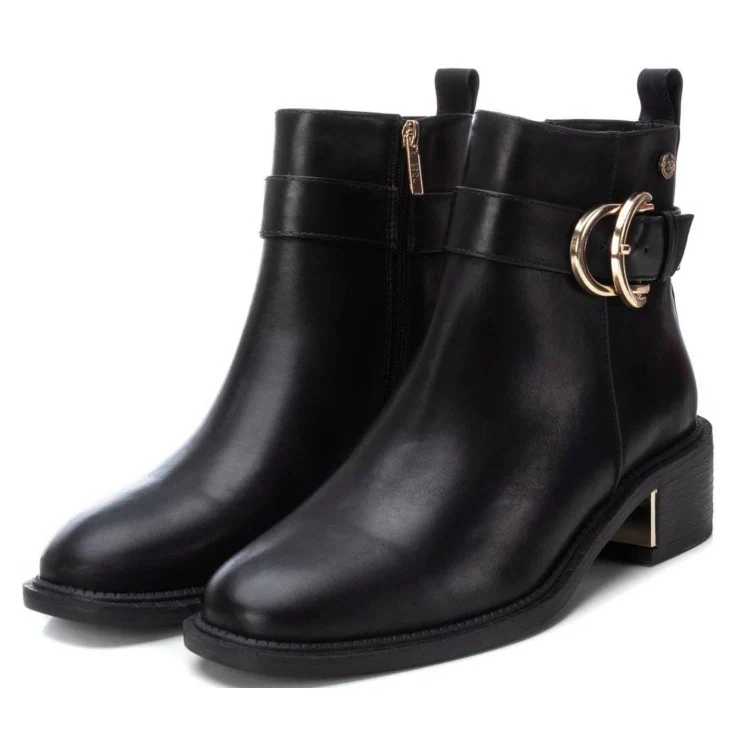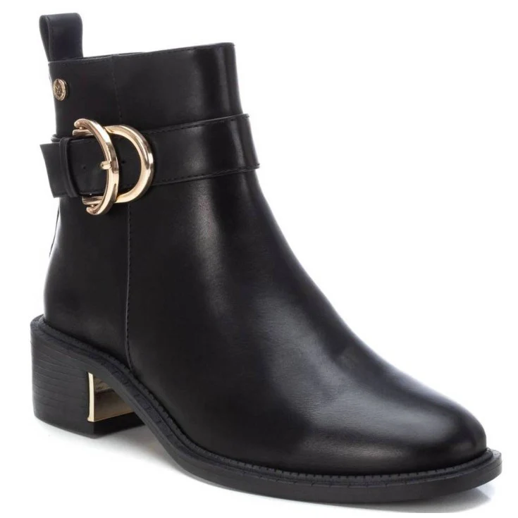 El Botín Chloe XTI en color negro es un modelo elegante y sofisticado que combina sencillez con un toque distintivo gracias a su hebilla metálica dorada. Su tacón ancho y bajo garantiza comodidad, mientras que su diseño minimalista lo convierte en una pieza versátil que elevará cualquier look.