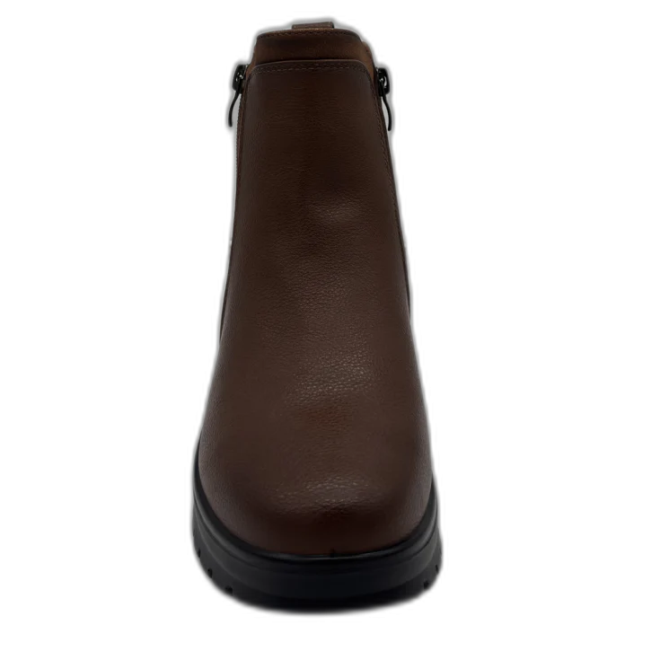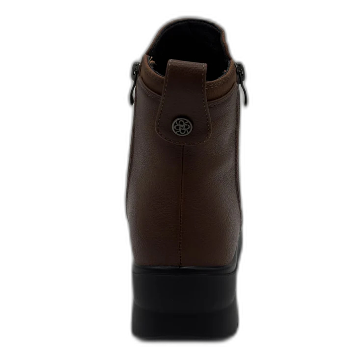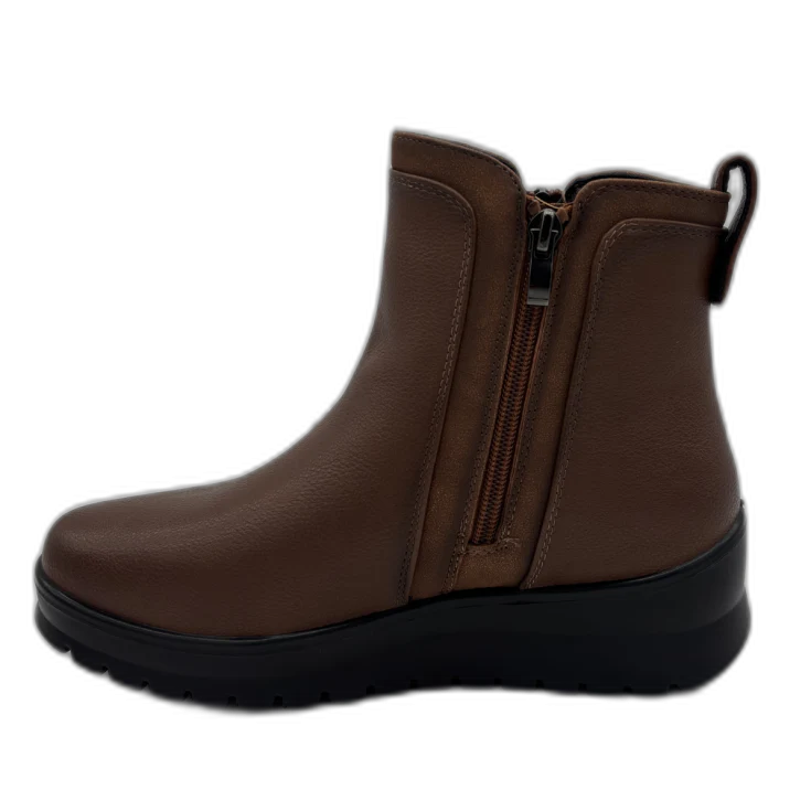 Diseñado para acompañarte en los días fríos con estilo y comodidad, este botín de cuña en tono cuero es la elección perfecta para quienes buscan un calzado versátil, cálido y fácil de combinar. Su diseño práctico con doble cremallera y su suela ligera con plataforma lo convierten en un imprescindible para el uso diario, aportando altura sin renunciar a la estabilidad.
