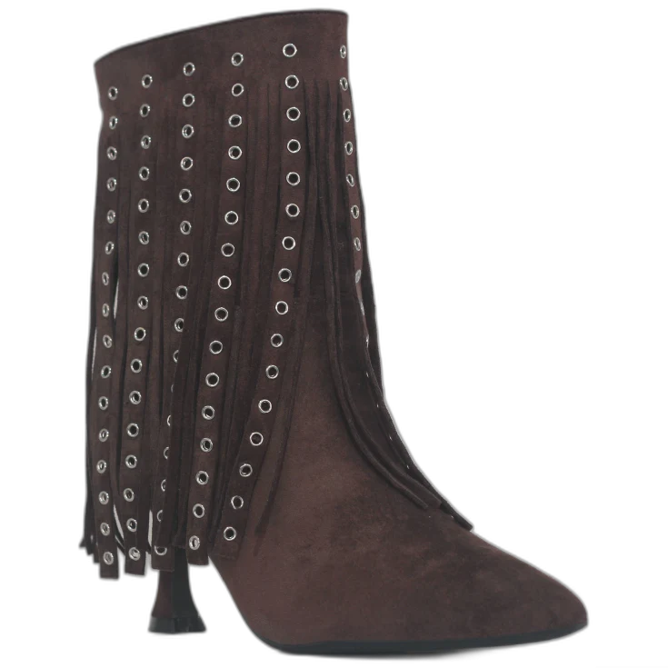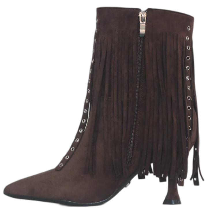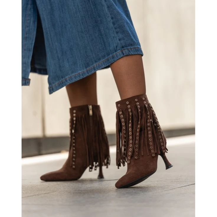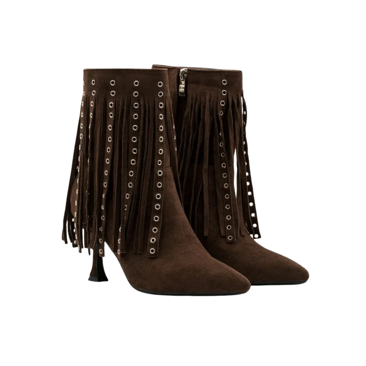 El Botín Tacón Glam en color marrón es la elección ideal para aportar un toque diferente y sofisticado a tus looks. Su acabado en antelina y los flecos con apliques metálicos le dan un aire atrevido y con carácter, perfecto para destacar en cualquier ocasión.