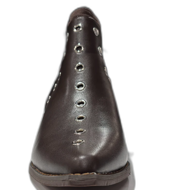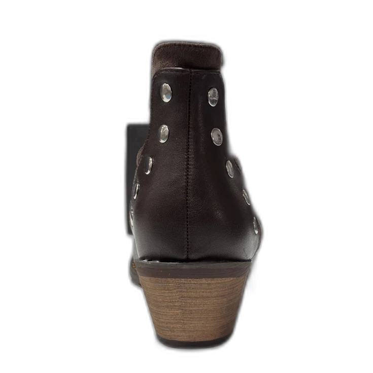 Este botín marrón destaca por su mezcla de texturas y la distribución estratégica de tachuelas que realzan su silueta. Su corte lateral abierto y el acabado suave del material aportan dinamismo y estilo, mientras que el tacón cómodo de 5 cm convierte cada paso en una experiencia estable y ligera, perfecta para el uso diario.
