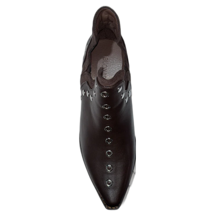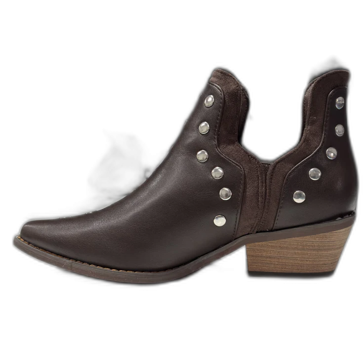 El Botín Isela Tachuela Marrón es la combinación perfecta entre estilo western y un toque urbano actual. Con su diseño marcado por tachuelas metálicas, líneas definidas y un tacón bajo efecto madera de 5 cm, se convierte en el aliado ideal para looks con personalidad.