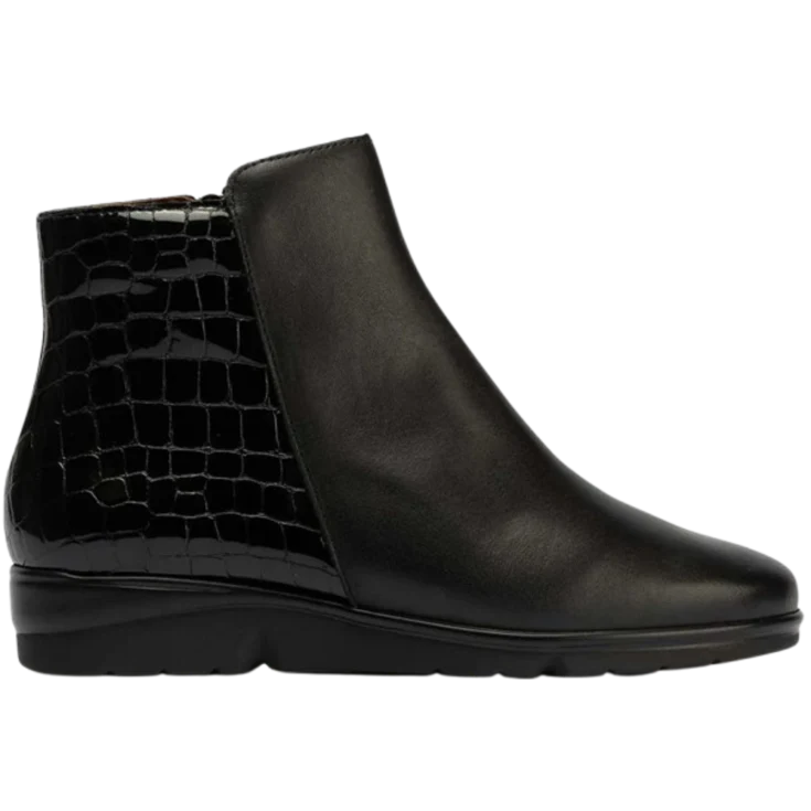Botin Aina, modelo de piel de la marca pitillos, en color negro con diferentes texturas, parte trasera de charol con pespuntes en forma de cuadrado, piso de goma, cuña de 2,5 cm y plataforma de 1 cm, puntera redonda y levantada para garantizar la comodidad.