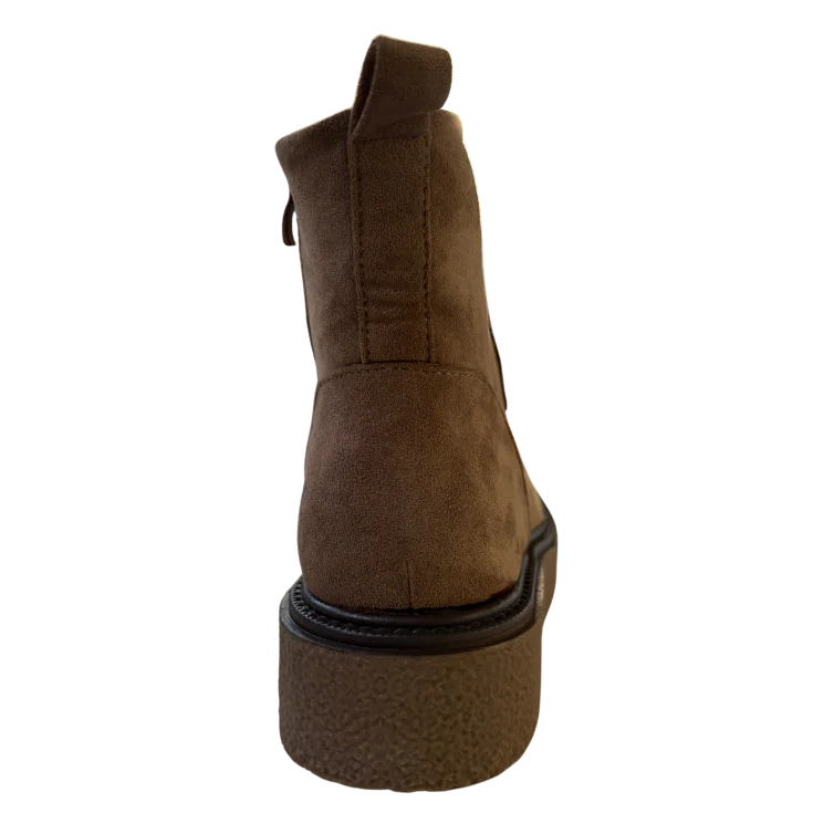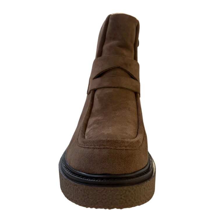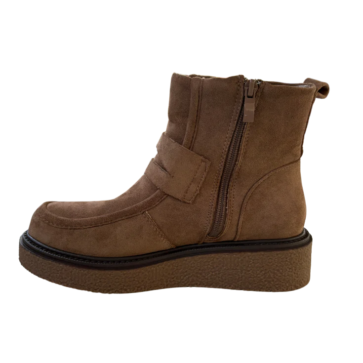 Este botín combina una silueta moderna con un acabado tipo serraje en color khaki, aportando un estilo natural y versátil. La plataforma ligera eleva el look sin comprometer la comodidad, mientras que su diseño envolvente ofrece una sensación de abrigo y estabilidad en cada paso.