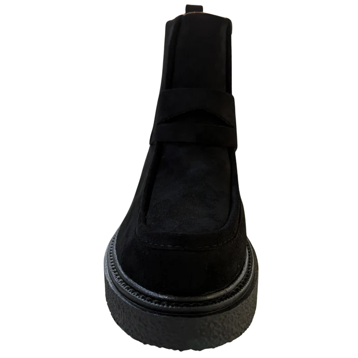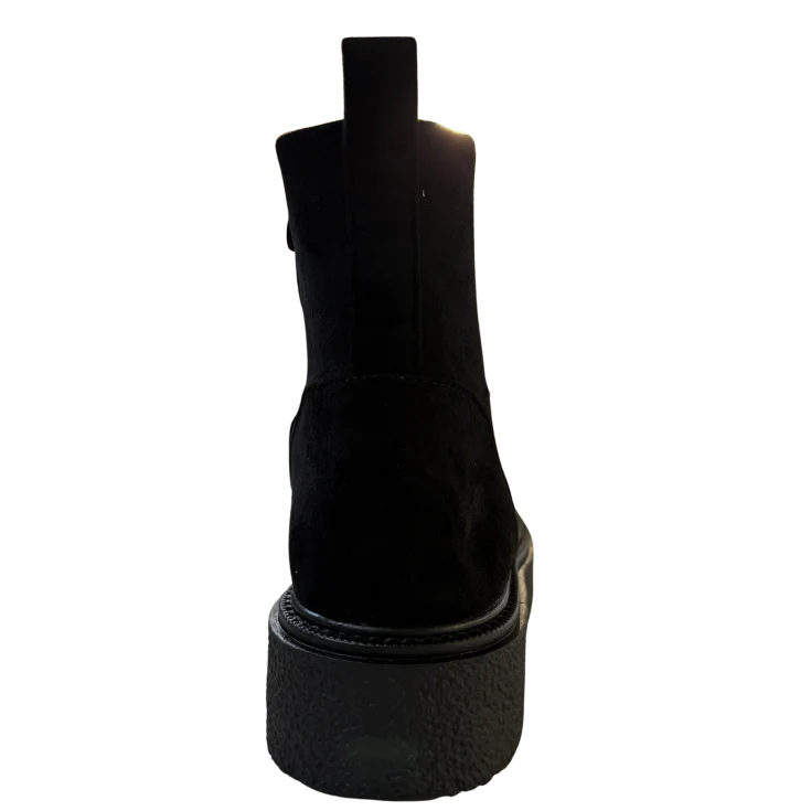 Este botín de caña media destaca por su diseño envolvente y su plataforma cómoda y estable, ideal para acompañarte durante largas jornadas. El color negro aporta un carácter atemporal y fácil de combinar, mientras que su silueta moderna lo convierte en una opción práctica y actual para la temporada.