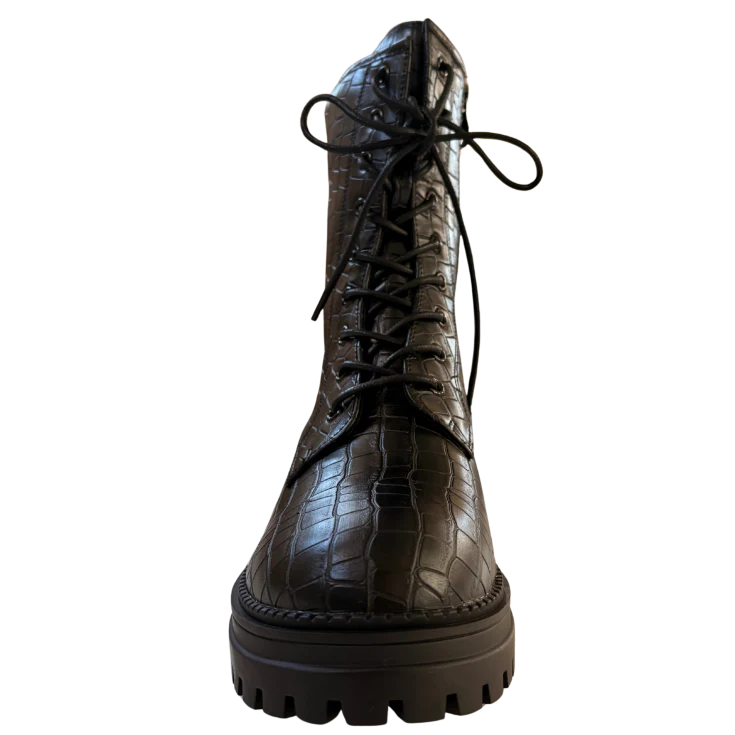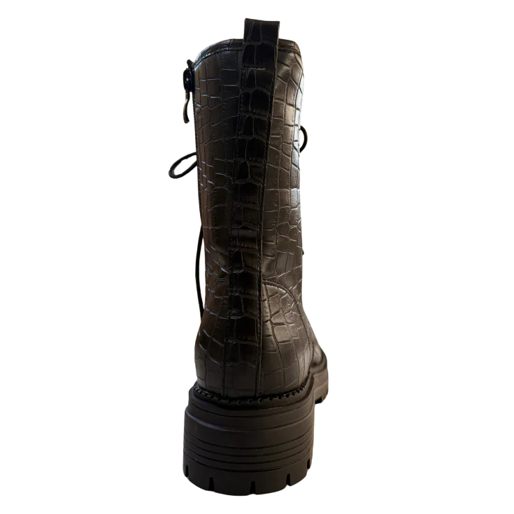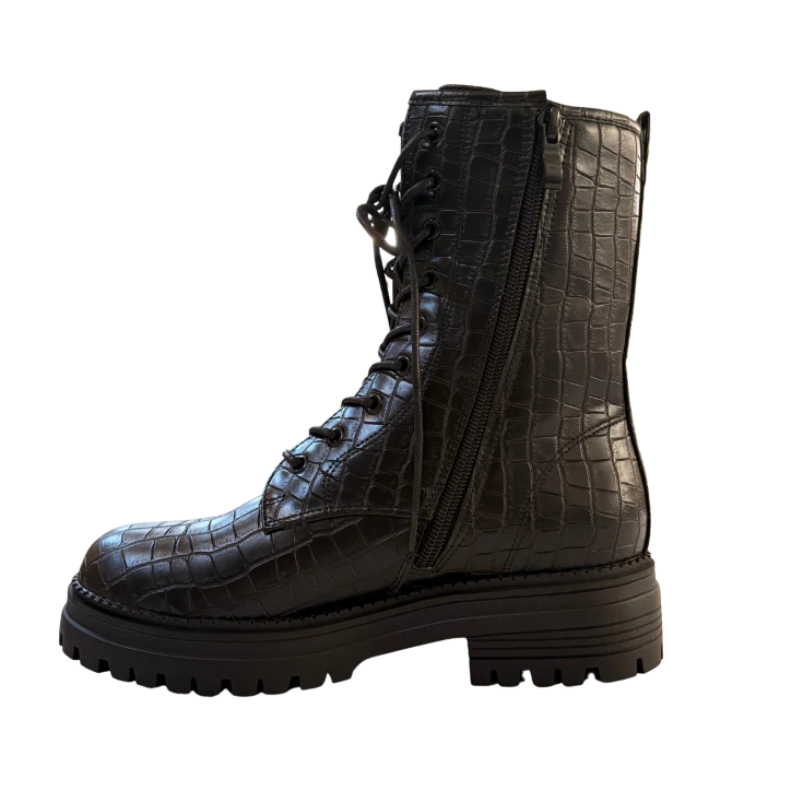 Este botín negro con plataforma destaca por su acabado efecto coco y su silueta robusta de inspiración combat. Su diseño con cordones y suela track crea un equilibrio perfecto entre moda y funcionalidad, convirtiéndolo en un imprescindible para quienes buscan un calzado potente y versátil para el día a día.