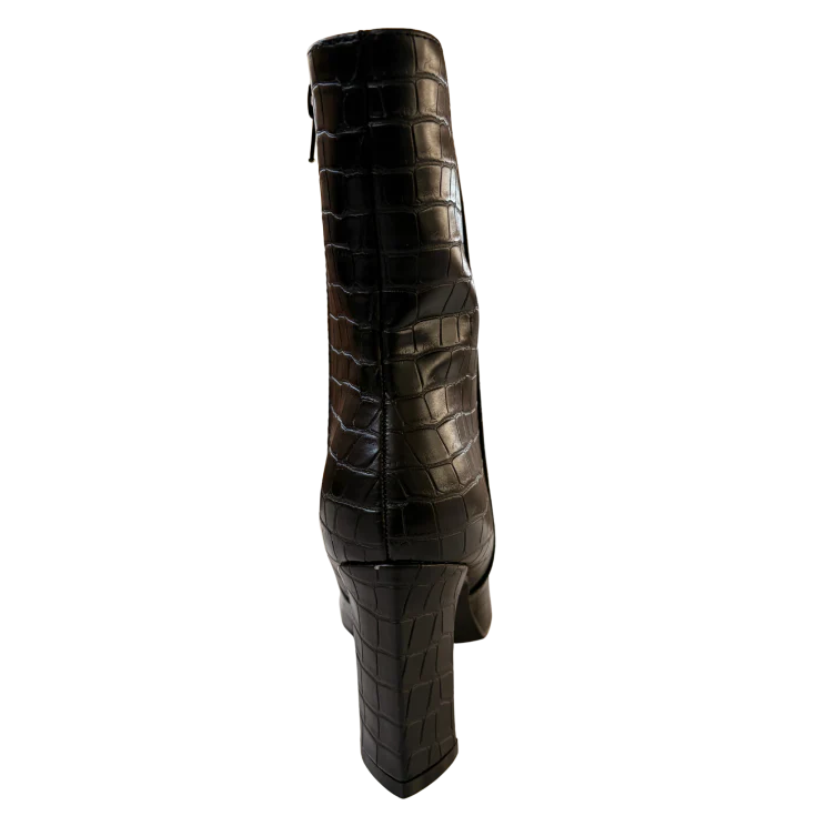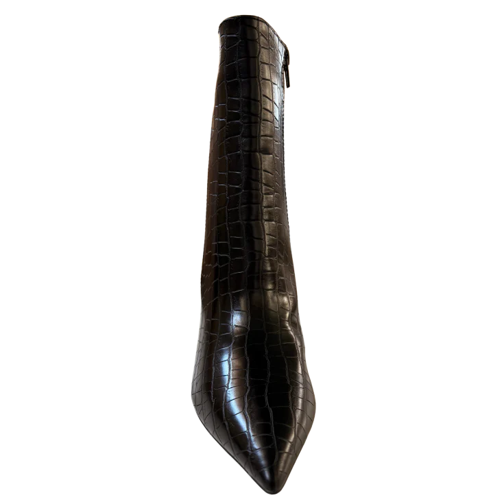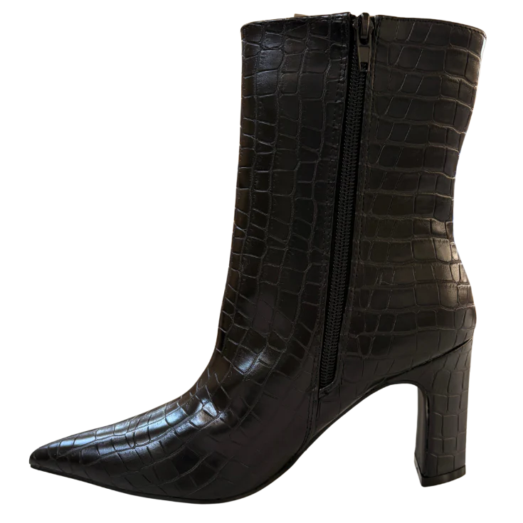 Este botín negro de caña media combina una silueta femenina con una textura efecto coco que aporta profundidad y personalidad. Su tacón medio de 8 cm estiliza la figura sin comprometer la estabilidad, mientras la punta fina alarga visualmente la pierna, creando un efecto elegante y favorecedor tanto en looks de día como de noche.