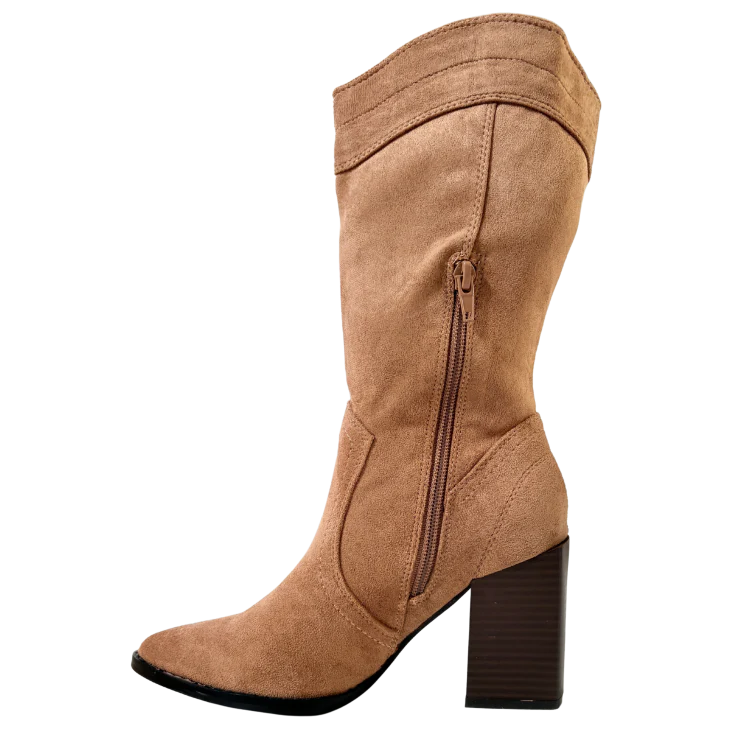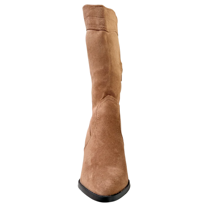 Confeccionada en un acabado tipo ante de color camel cálido, la Bota Mary destaca por su caña media y su tacón ancho que equilibra estilo y comodidad. Un diseño versátil que transita con naturalidad del día a la noche, ideal tanto para looks urbanos como para ocasiones más especiales.