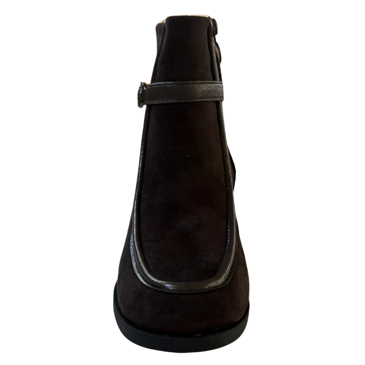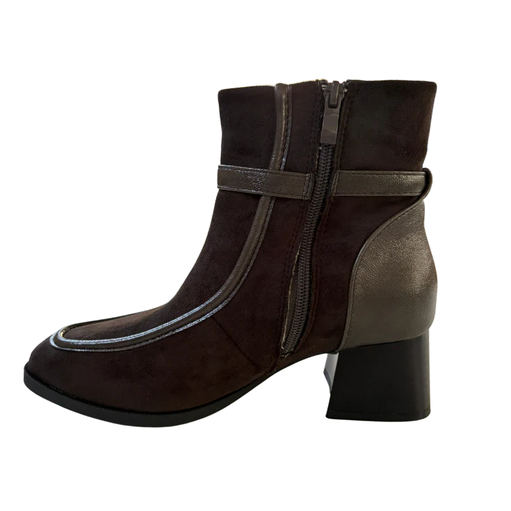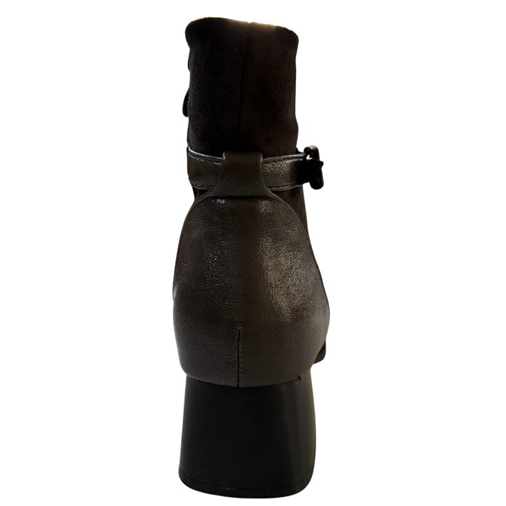 Este botín destaca por su diseño envolvente y su acabado en tono gris oscuro con matices cálidos, ideal para aportar profundidad y personalidad a cualquier conjunto. Su silueta equilibrada y su tacón estable lo convierten en una opción versátil para el día a día, desde la oficina hasta planes más informales.