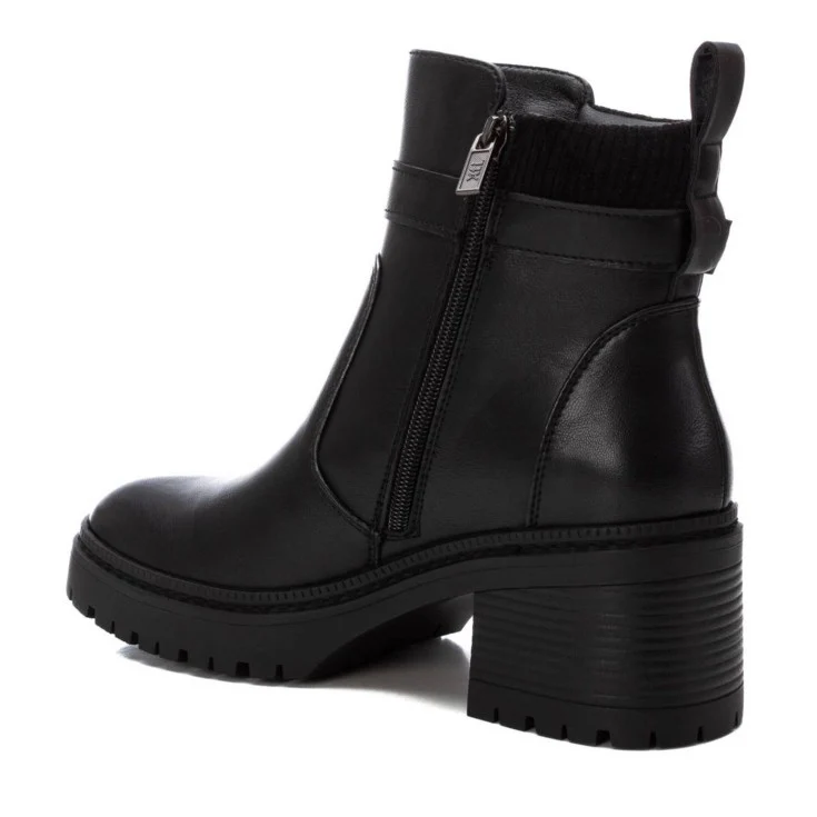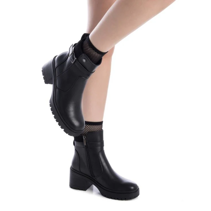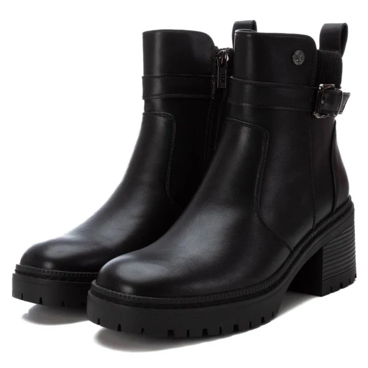 El Botín XTI Praga en color negro combina estilo y comodidad para convertirse en un imprescindible de tu armario esta temporada. Con un diseño elegante de tacón medio, hebilla decorativa y acabado en piel sintética de alta calidad, es perfecto para elevar cualquier look urbano o casual.