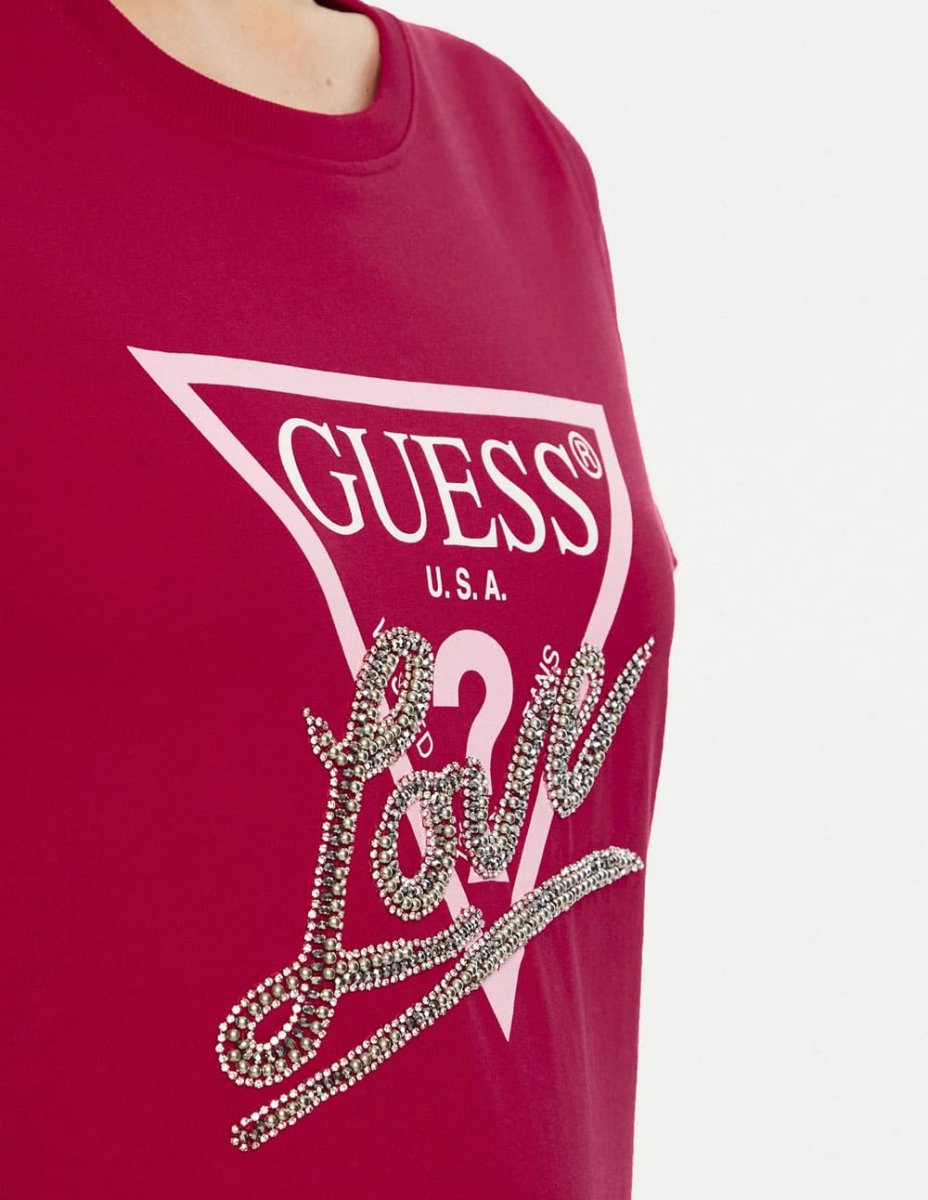 La Camiseta GUESS con Logo Triángulo con Strass Rosa combina feminidad y brillo en un diseño icónico. Confeccionada en algodón elástico, ofrece un ajuste cómodo y favorecedor. El detalle de strass en el logo añade un toque glamuroso, ideal para destacar en looks casuales con un estilo actual y chic.