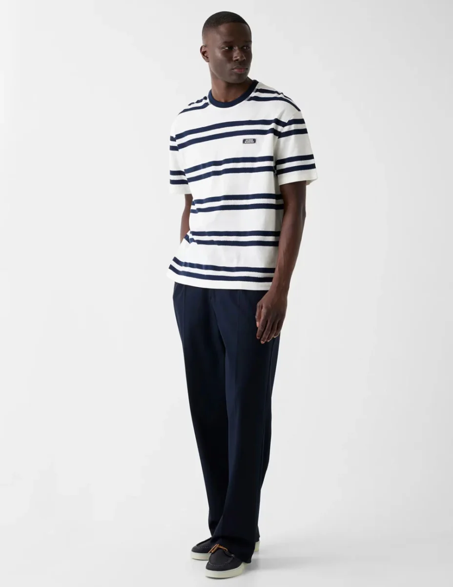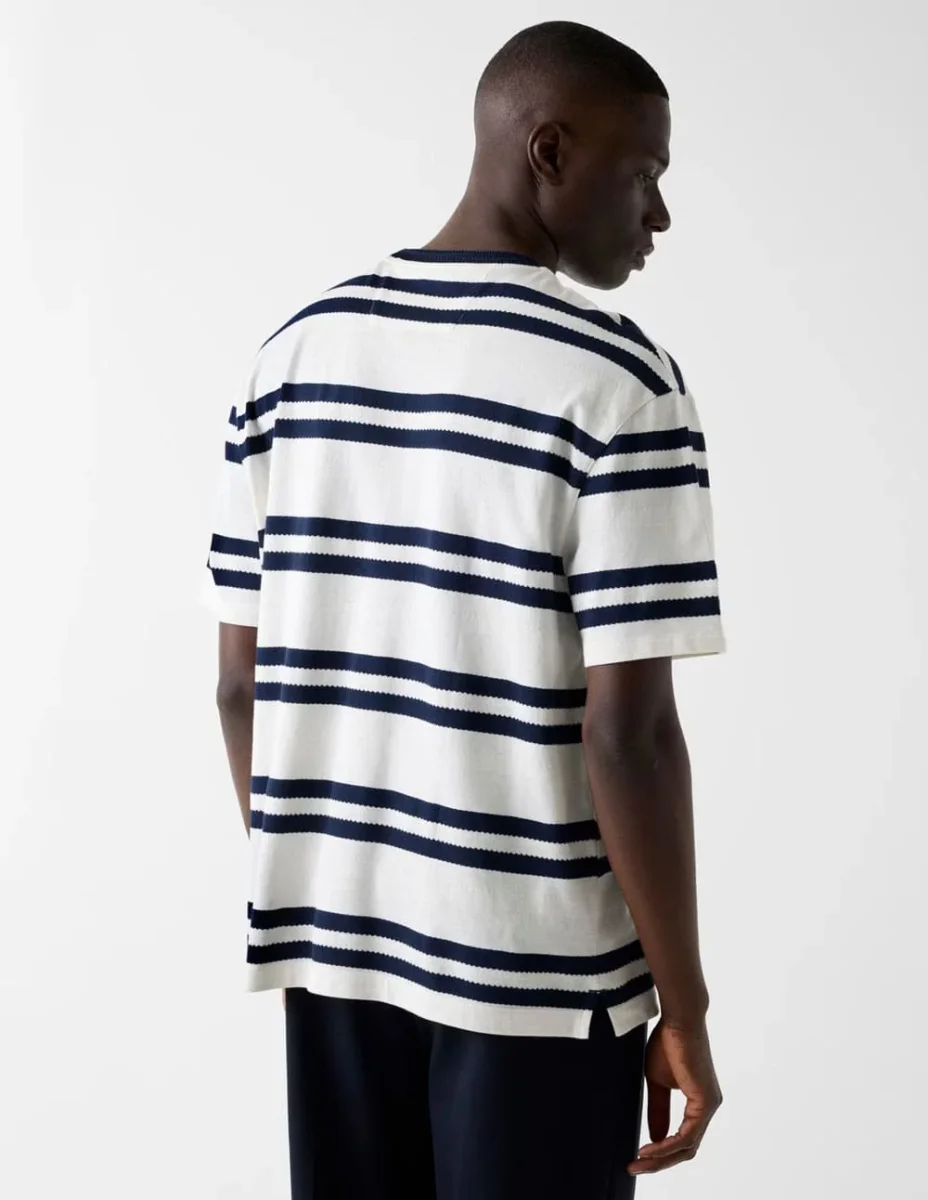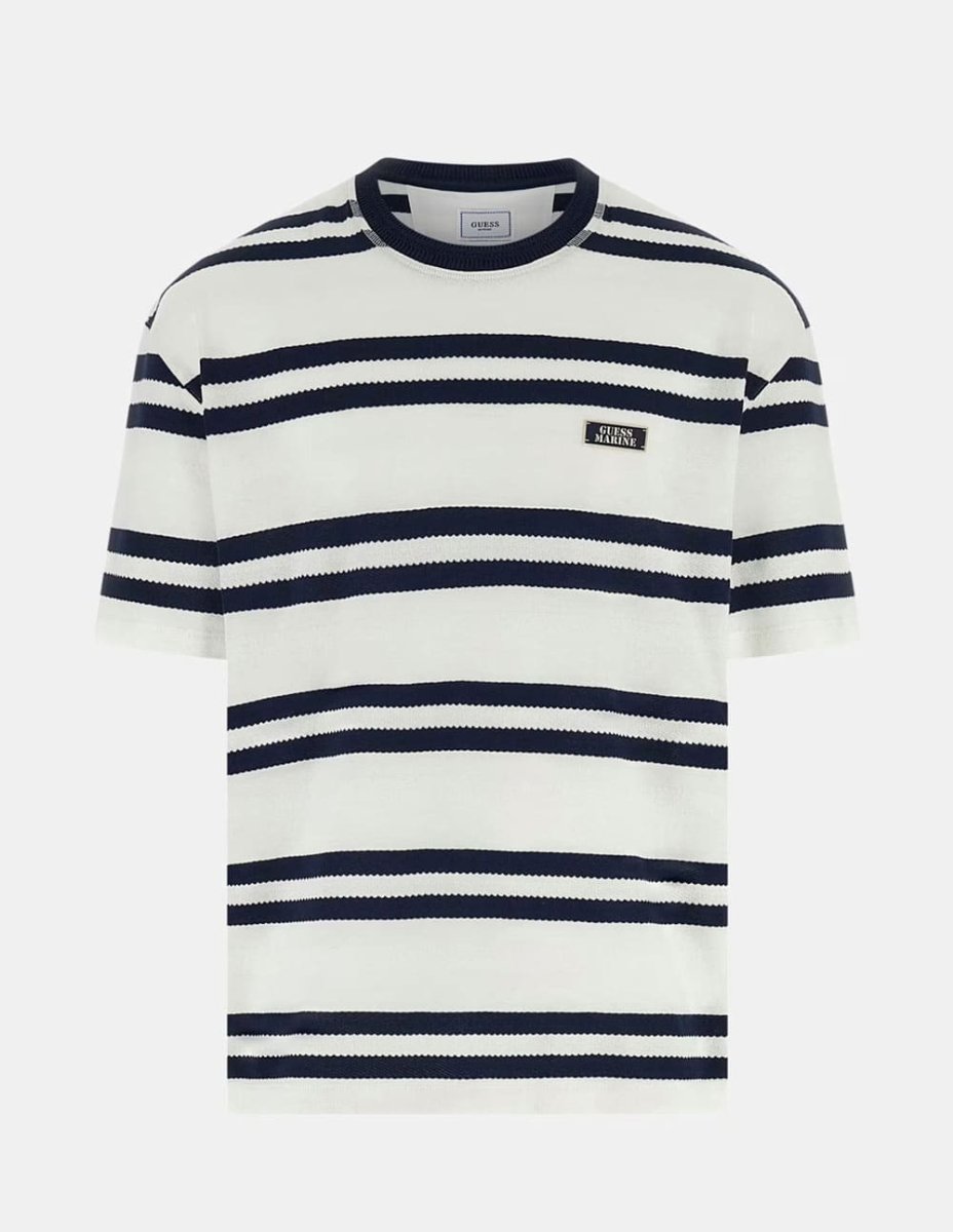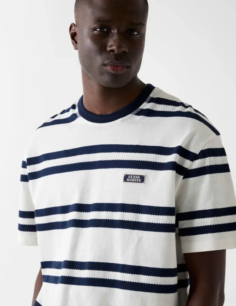 La Camiseta GUESS de Punto a Rayas Azul y Blanca combina un estilo fresco y actual perfecto para el día a día. Su diseño de rayas aporta un toque dinámico al look, mientras el tejido de punto ofrece comodidad. Fácil de combinar, encaja en conjuntos casuales con un aire moderno.