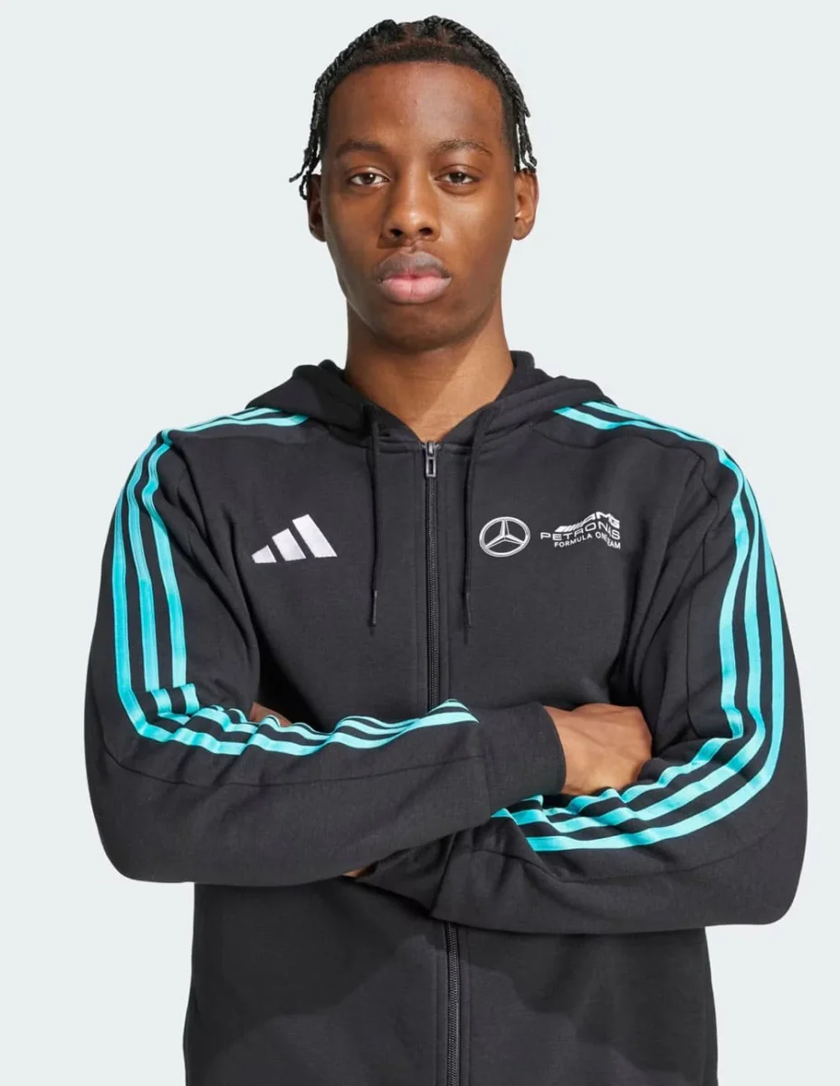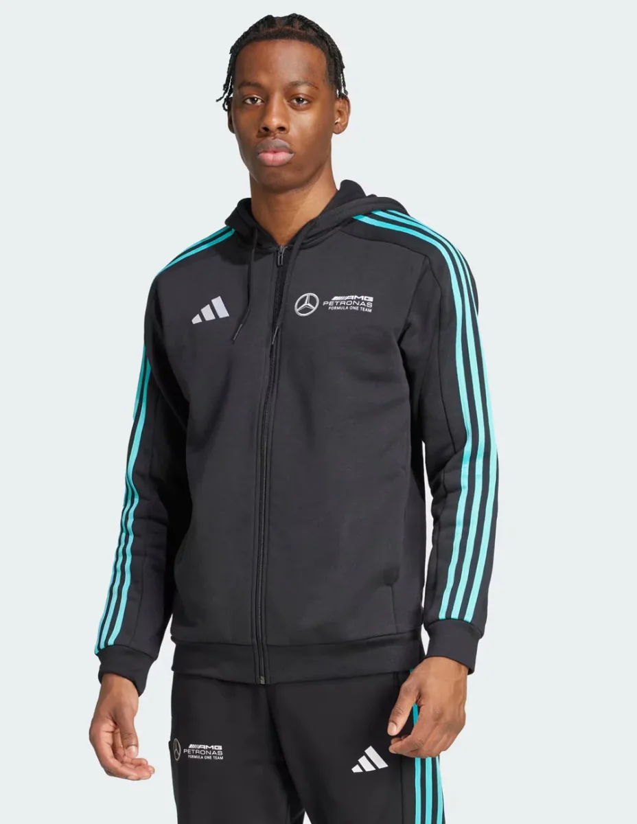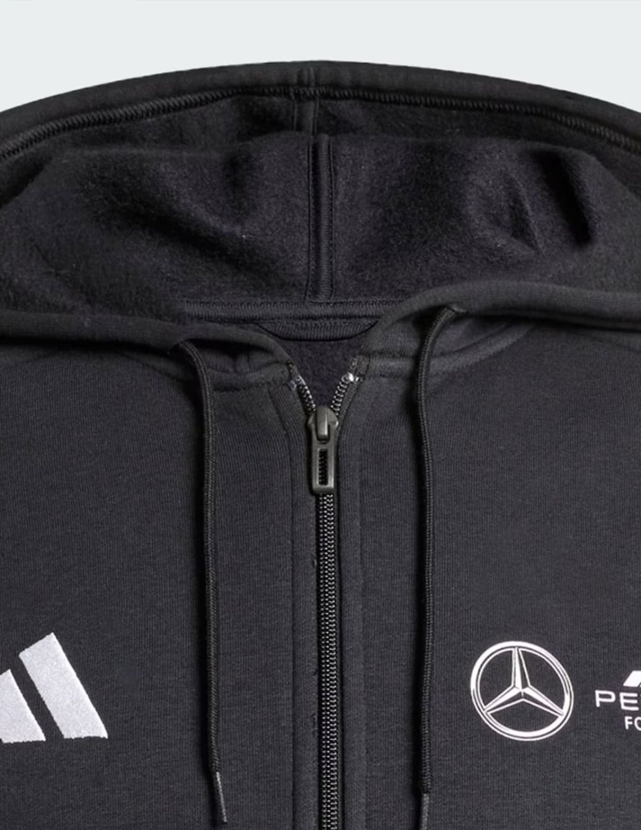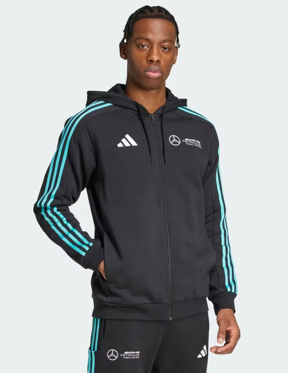 La chaqueta con capucha adidas Mercedes-AMG Petronas Fórmula I Team Negra es perfecta para los amantes del automovilismo. Con un diseño inspirado en la F1, combina estilo y funcionalidad. Su tejido de alta calidad proporciona confort y protección, ideal para lucir un look deportivo y sofisticado en cualquier ocasión.