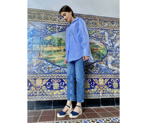 La textura del esparto teñido en azul marino aporta una sensación de frescura costera.