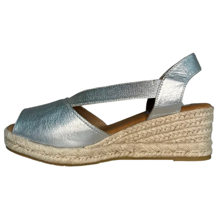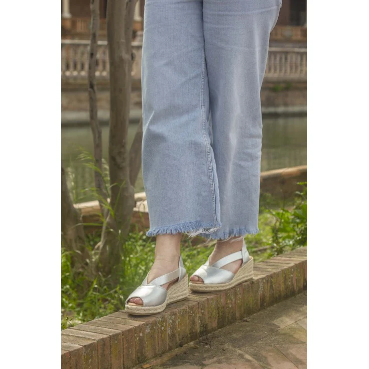 La Cuña de Esparto Cris Plata es la combinación perfecta entre frescura mediterránea y brillo sofisticado. Su acabado en tono plata aporta un toque moderno y luminoso, mientras que la cuña de esparto natural mantiene esa esencia artesanal tan característica del verano. Un modelo versátil y cómodo que eleva cualquier look en segundos.