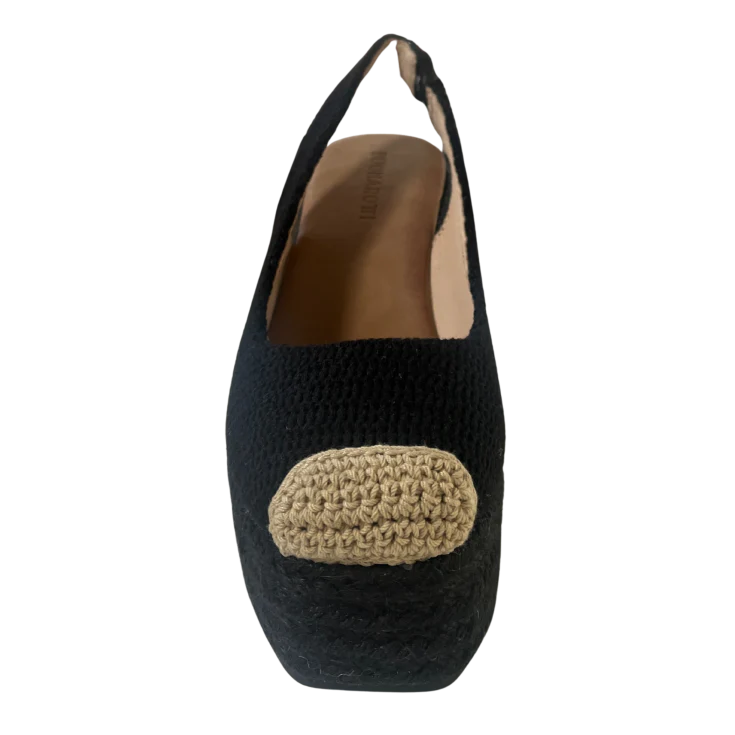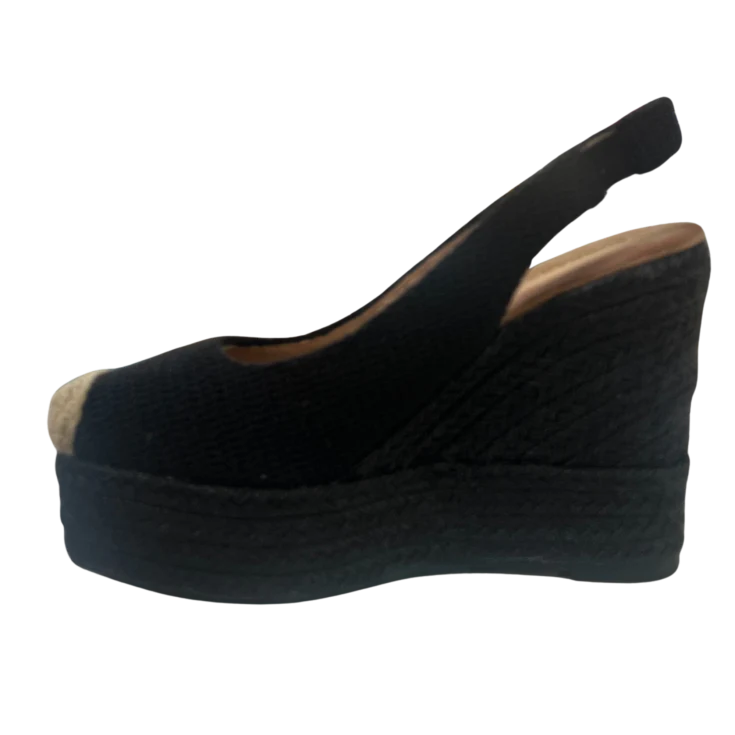 Esta cuña de esparto en color negro combina un diseño cerrado en la parte delantera con talón abierto y sujeción trasera, creando una silueta femenina y favorecedora. El contraste entre el tejido negro y la puntera en acabado natural aporta carácter y distinción.