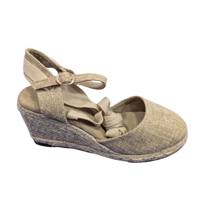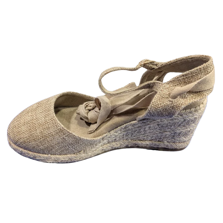 Una cuña ligera y estable que estiliza sin cansar, confeccionada en tejido beige de textura natural y con una silueta elegante que combina fácilmente con vestidos, faldas o pantalones fluidos.