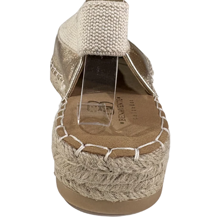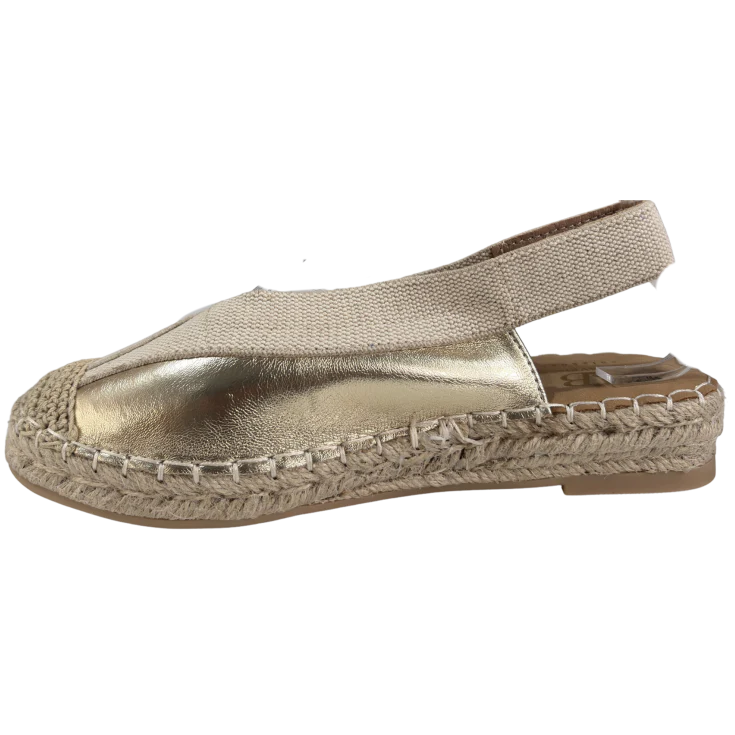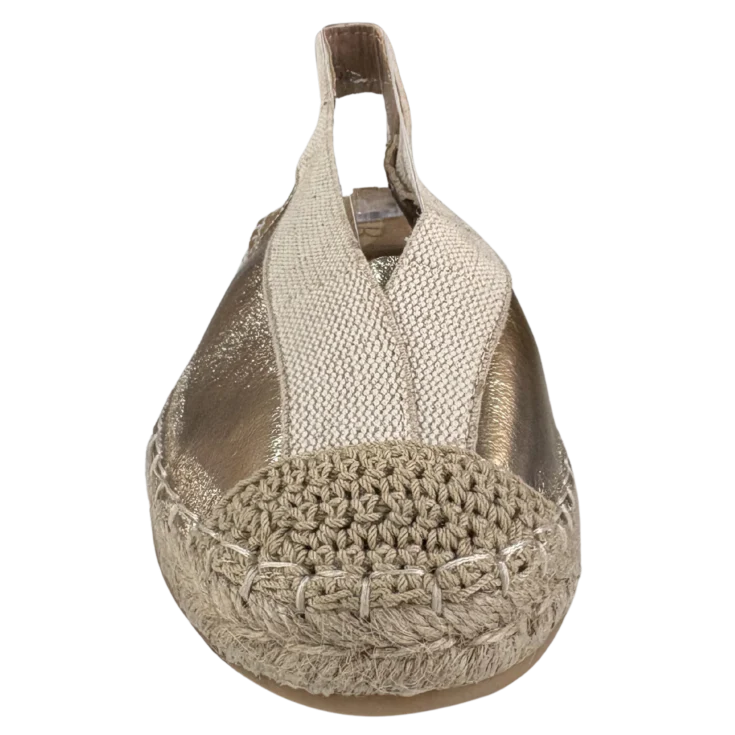 Brillo sutil, esencia mediterránea y comodidad absoluta en un diseño versátil. La Cuña de Esparto Plana Oro Marina combina la naturalidad del esparto trenzado con un acabado metalizado en tono oro que aporta luz y sofisticación a cualquier look de primavera y verano. Perfecta para elevar tus outfits diarios con un toque elegante sin renunciar al confort.