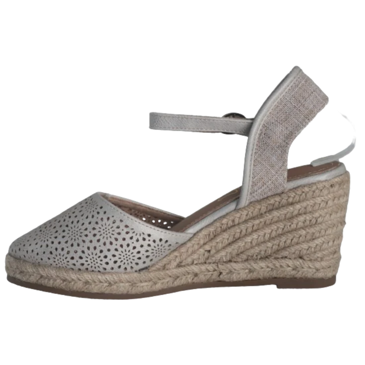 Este modelo destaca por su empeine cerrado con diseño calado que permite mayor transpiración y aporta un detalle visual muy femenino. La pulsera ajustable al tobillo con hebilla metálica garantiza una sujeción firme y cómoda. La cuña de esparto natural trenzado mantiene la esencia mediterránea, aportando estabilidad y altura ideal para el día a día o eventos especiales.