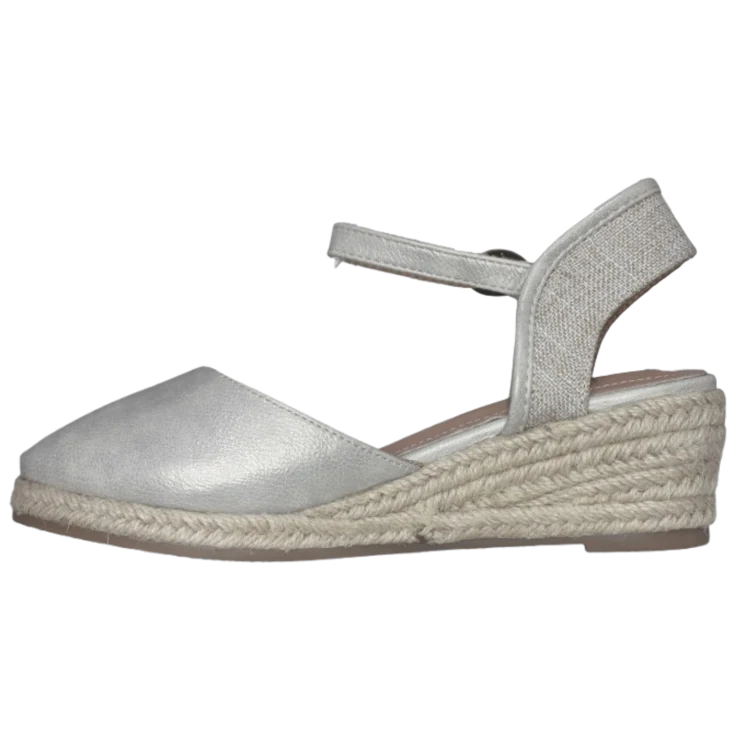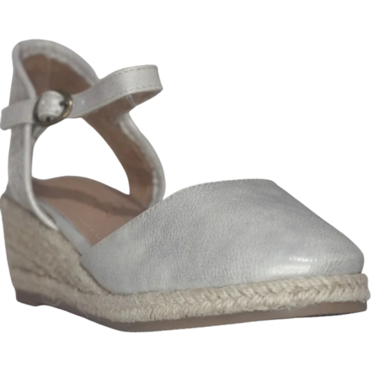 La Cuña de Esparto Sur Platino es la combinación perfecta entre elegancia luminosa y esencia mediterránea. Su acabado en tono platino aporta un brillo sofisticado y moderno, mientras que la cuña de esparto natural mantiene ese aire artesanal que nunca pasa de moda. Ideal para elevar tus looks de verano con un toque refinado y femenino.