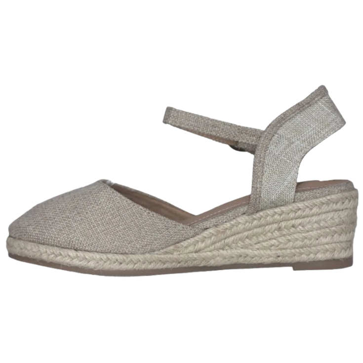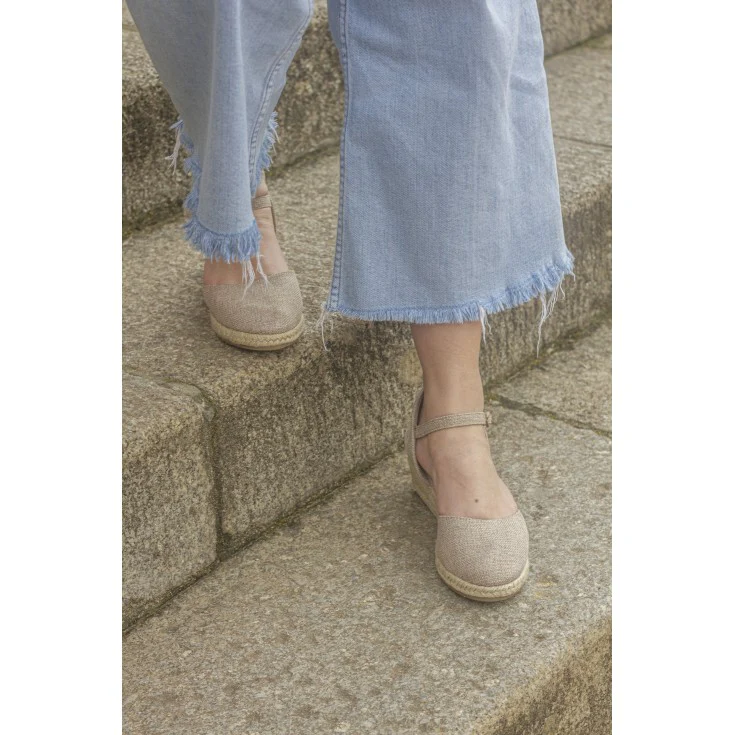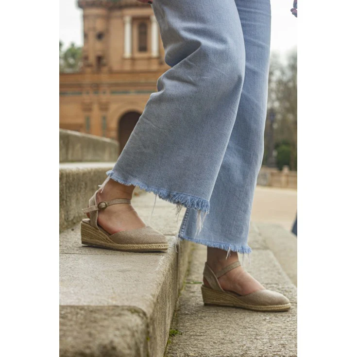 La cuña de esparto trenzado añade una sensación visual cálida y veraniega que combina a la perfección con tejidos ligeros como lino o algodón.