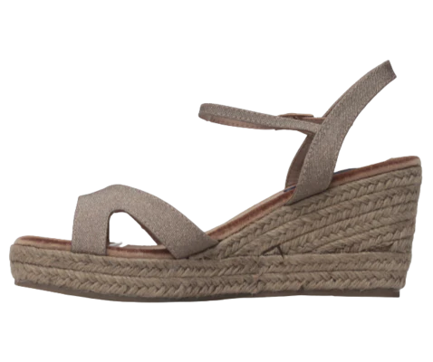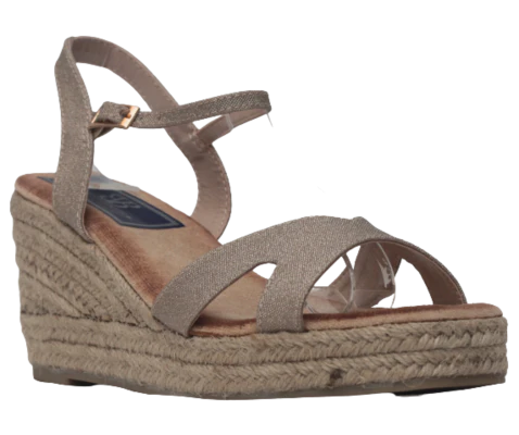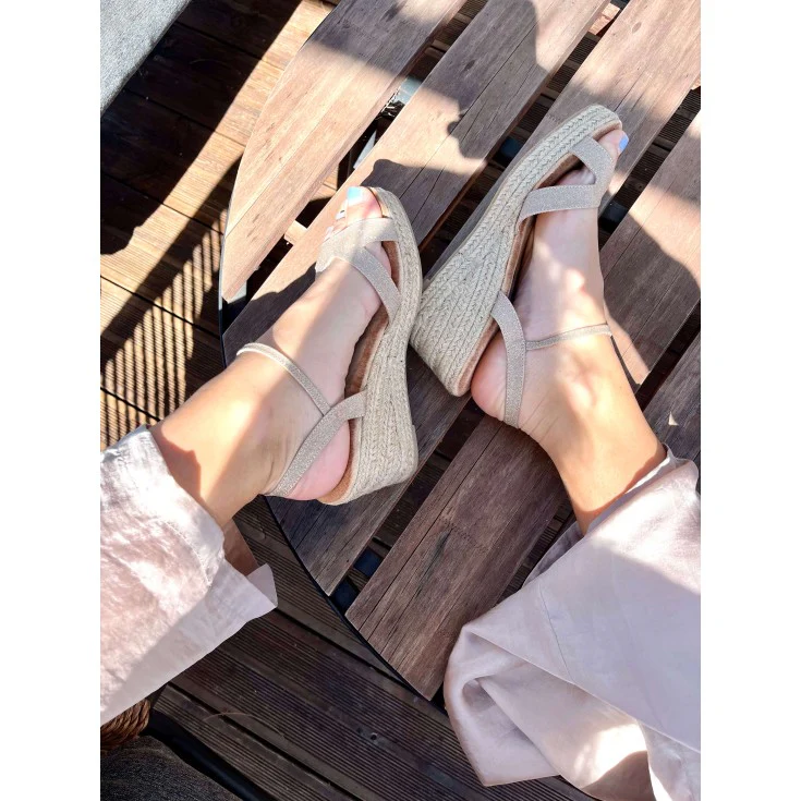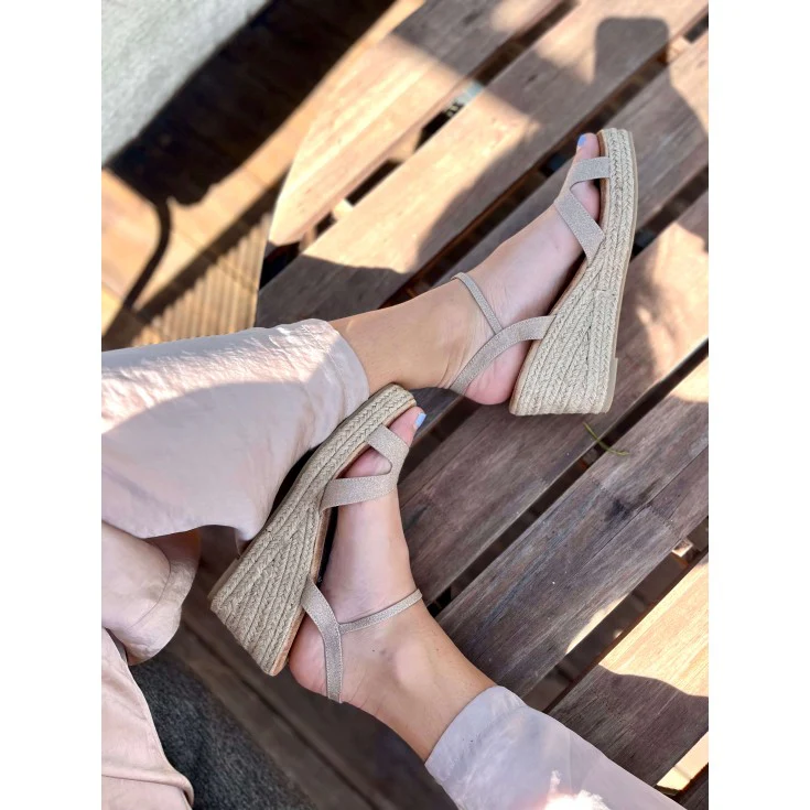 Cuña de esparto Aguasantas, modelo en color oro, con una tira en la parte de el empeine, plantilla de memory foam para garantizar la comodidad, cierre de hebilla al tobillo, plataforma de 2 cm y cuña de 7,5 cm