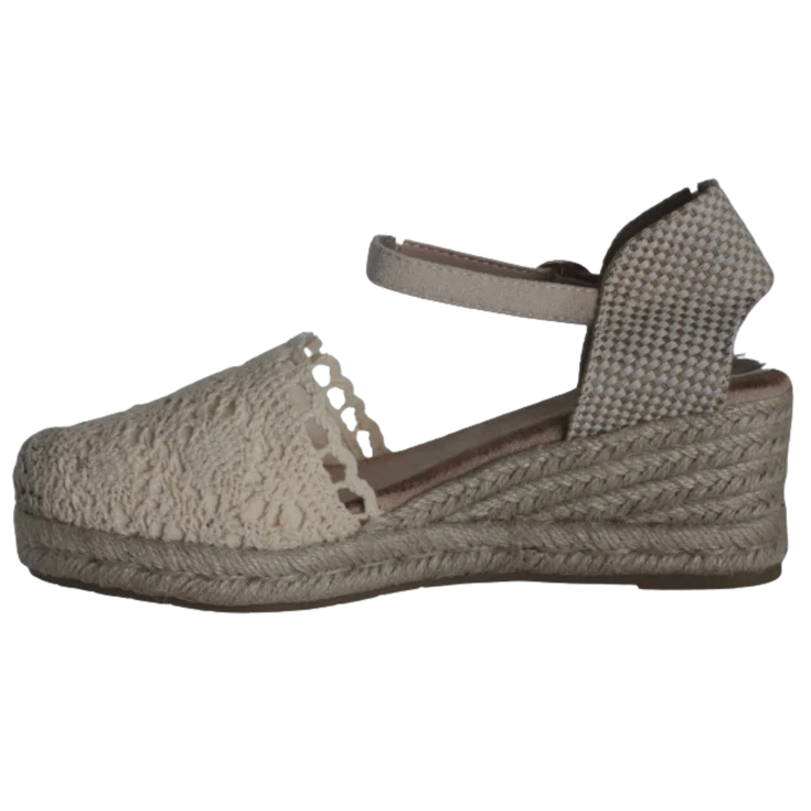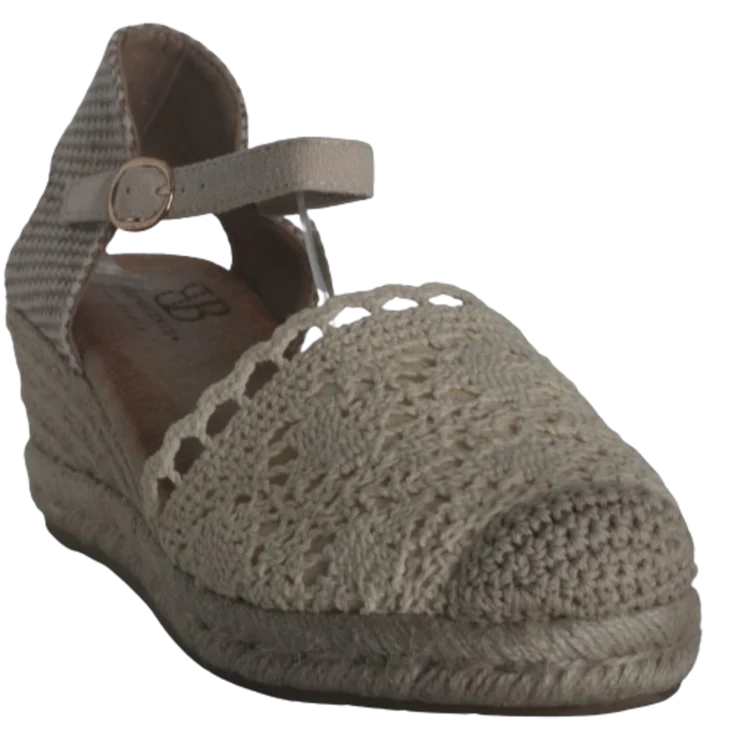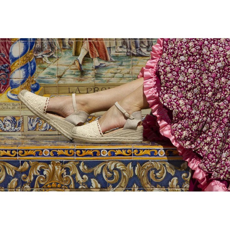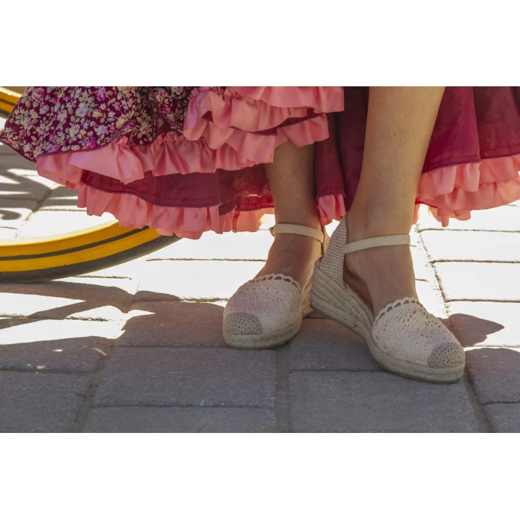 Esta cuña de esparto combina la tradición del trenzado natural con un empeine tejido de efecto crochet que aporta textura y personalidad. Su pulsera ajustable al tobillo garantiza sujeción y estabilidad, mientras la cuña de esparto estiliza la figura sin renunciar a la comodidad. Ideal para eventos de día, vacaciones o looks boho chic.