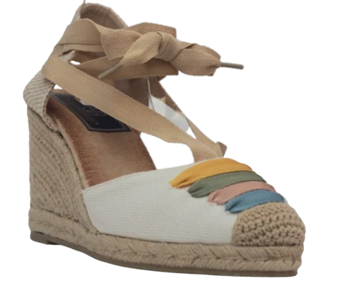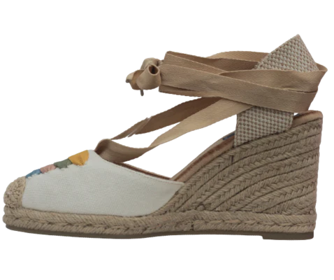 Diseñada para destacar con naturalidad, esta cuña de esparto combina un empeine textil blanco con detalles bordados llenos de color y cintas para atar al tobillo que estilizan la pierna de forma elegante. Su cuña de esparto trenzado aporta altura con estabilidad, y la plantilla memory foam se adapta al pie ofreciendo una pisada suave y confortable. Ideal para eventos de verano, vacaciones o looks boho chic.