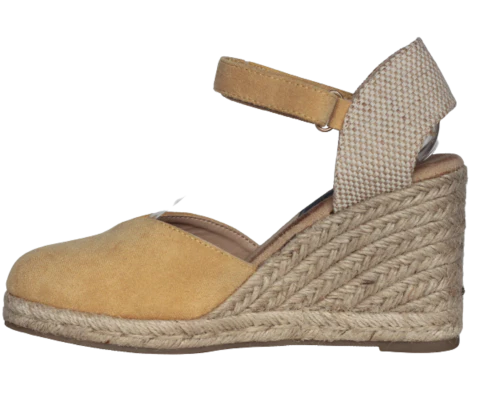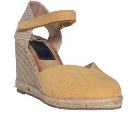 Cuña de esparto Formentera de color amarillo, pala en forma de pico, cierre de velcro para poder adaptar a su tobillo, plantilla de foam para máxima comodidad, plataforma de 1,5 cm y cuña de 8,5 cm