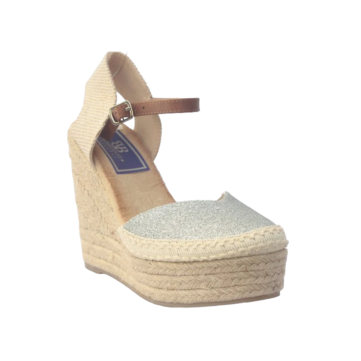 Cuña de esparo Maldivas, modelo en color oro con brillo, parte de la puntera bordada de color blanco, plantilla de memory foam para garantizar la comodidad al caminar, cierre de hebilla al tobillo en color cuero, plataforma de 2,5 cm y cuña de 11,5 cm