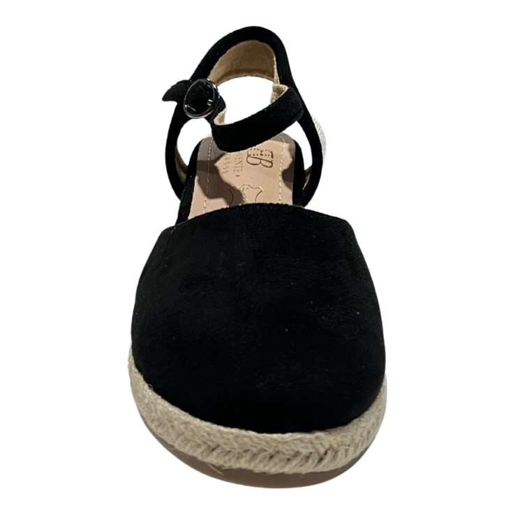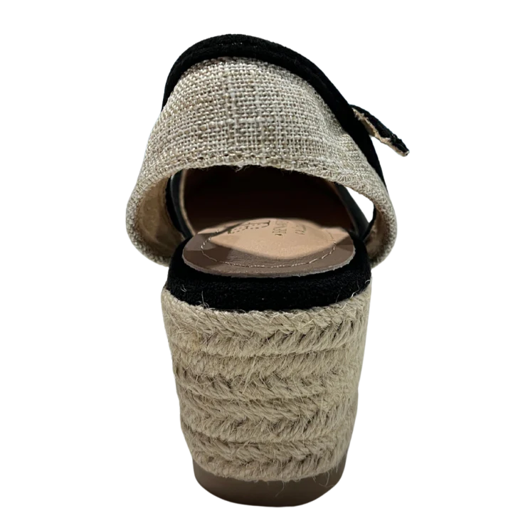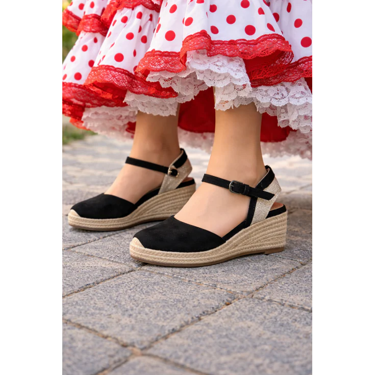 El tacto suave del material negro envuelve el pie con delicadeza, mientras que la cuña de esparto aporta una sensación natural y fresca. La combinación de plataforma y cuña proporciona una pisada firme y equilibrada, permitiendo caminar con comodidad durante horas.