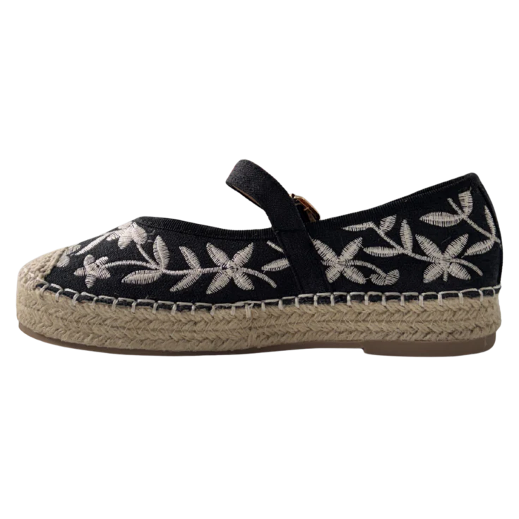 Diseñada para acompañarte en los días más cálidos, esta alpargata de esparto destaca por su tejido negro con delicados bordados en contraste que aportan personalidad y estilo. Su pulsera con hebilla permite un ajuste cómodo y seguro, mientras que la suela de esparto trenzado proporciona estabilidad y ligereza en cada paso.